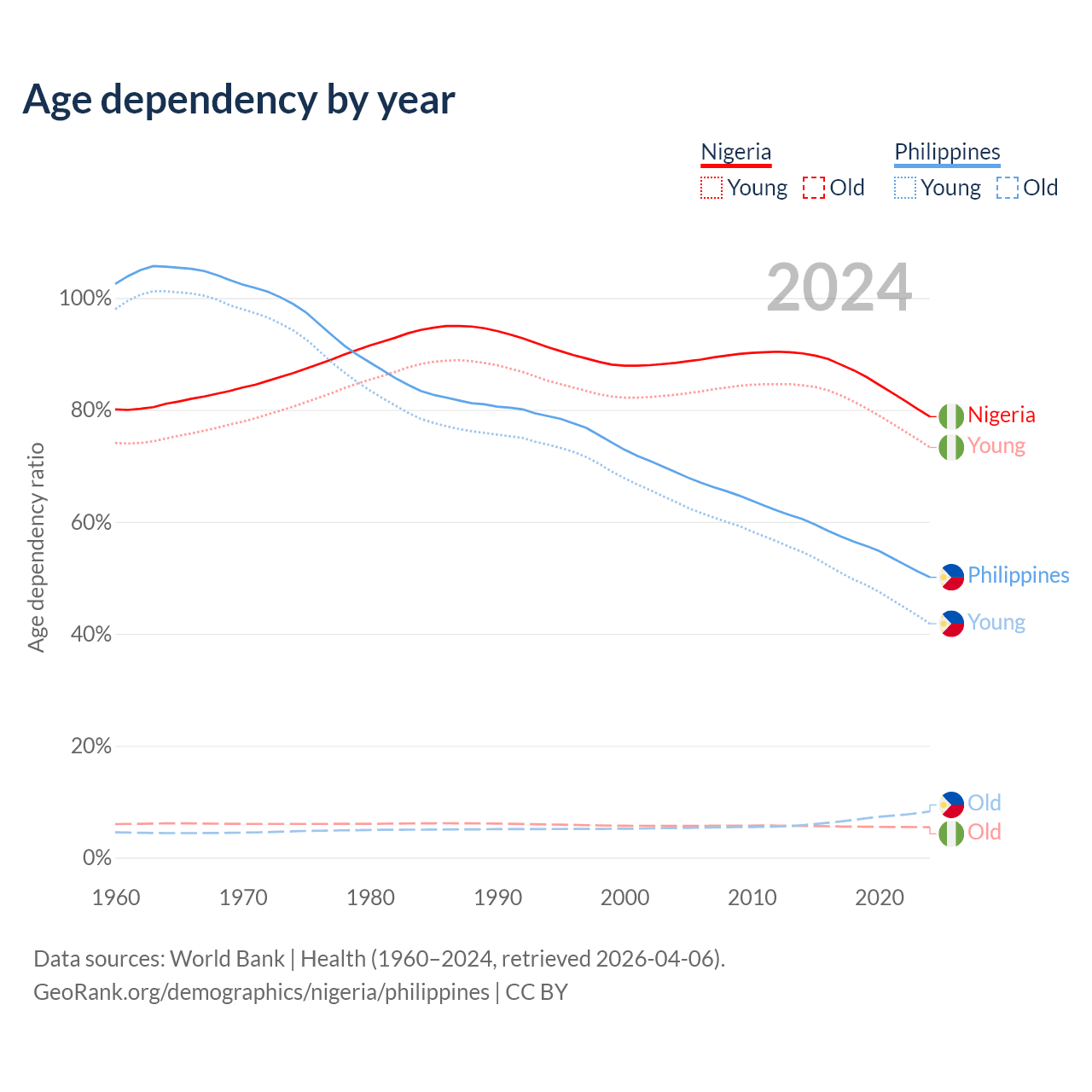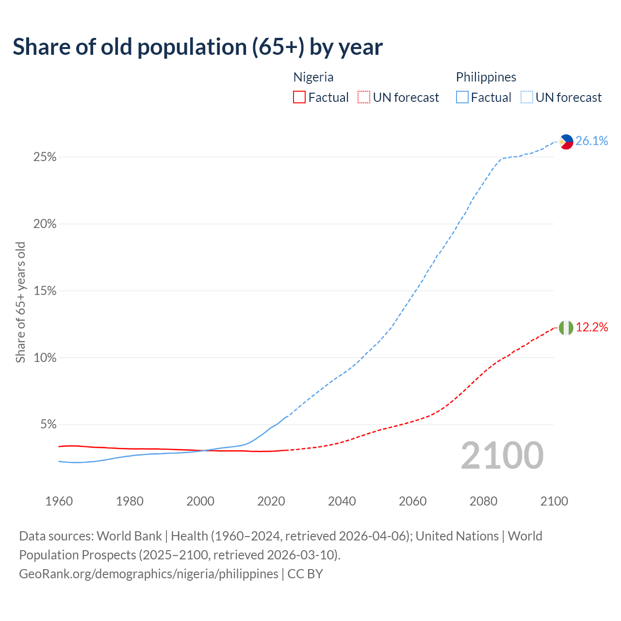 The share of older people aged 65 and over is 3.05% in Nigeria and 5.49% in the Philippines. Life expectancy in Nigeria compared to the Philippines .