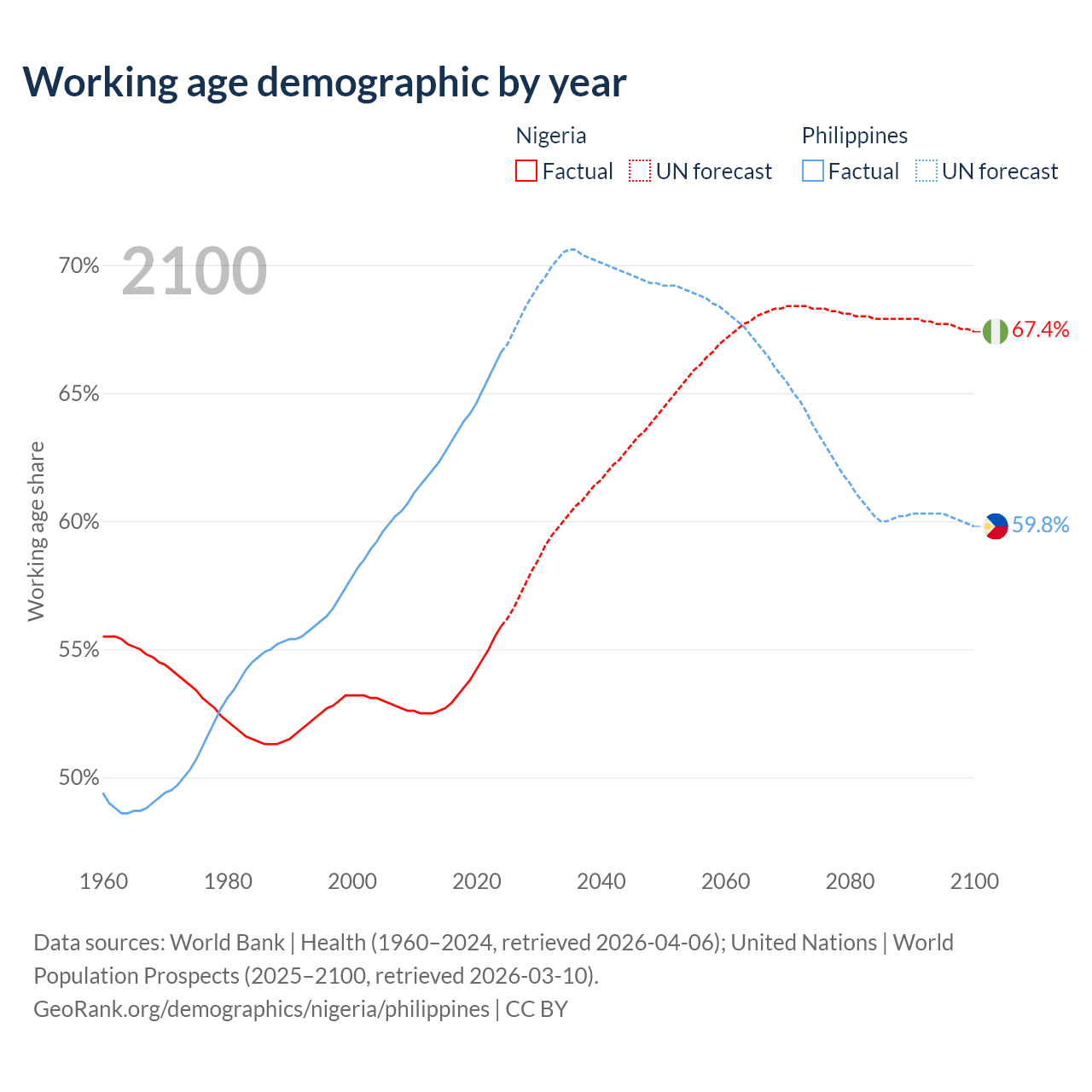 - Nigeria has 136M working age adults (aged 15-64) vs 78.6M in the Philippines.