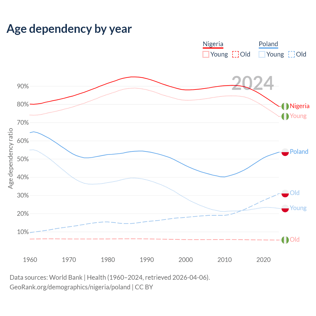 - Nigeria is ranked 178/196 by median age (oldest to youngest) vs 30/196 for Poland.