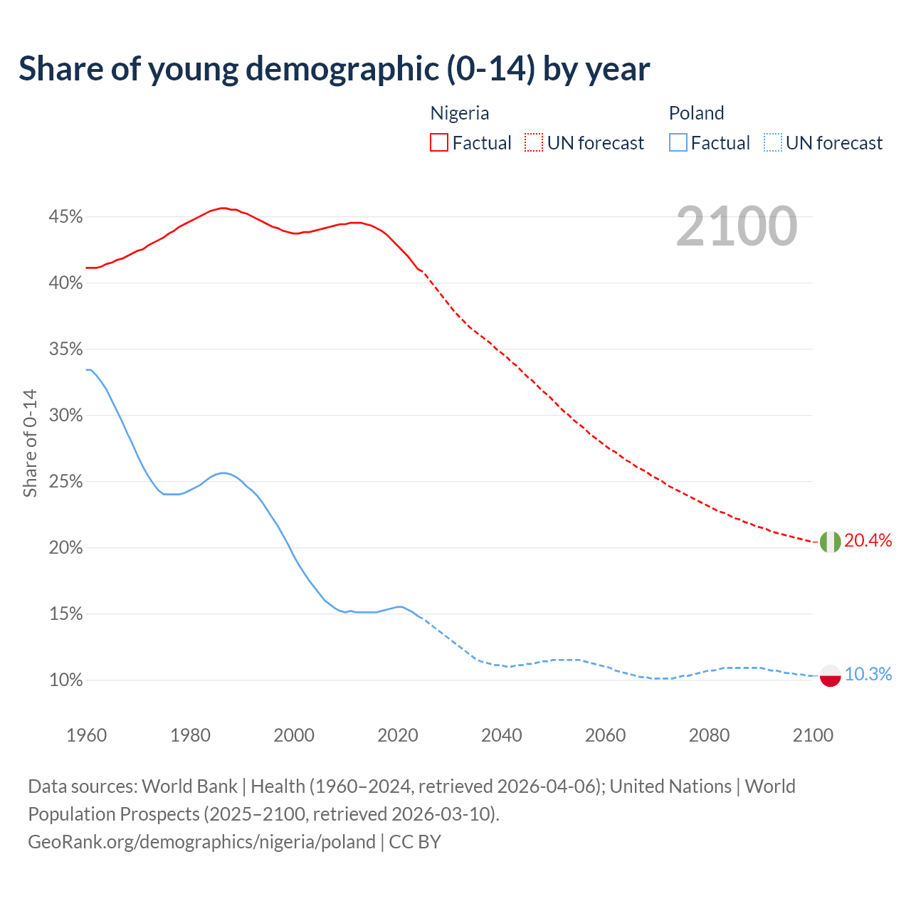 - The share of young demographic (0-15 years old) in Nigeria is 41% vs 14.8% in Poland.