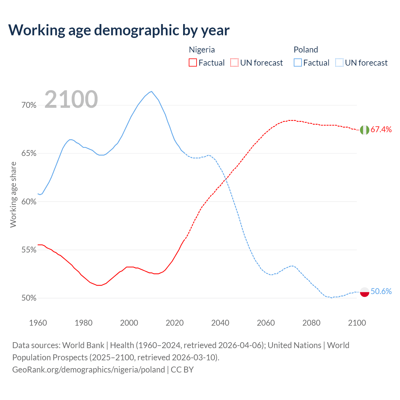 - Nigeria has 136M working age adults (aged 15-64) vs 23.3M in Poland.
