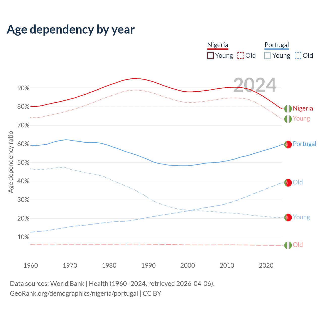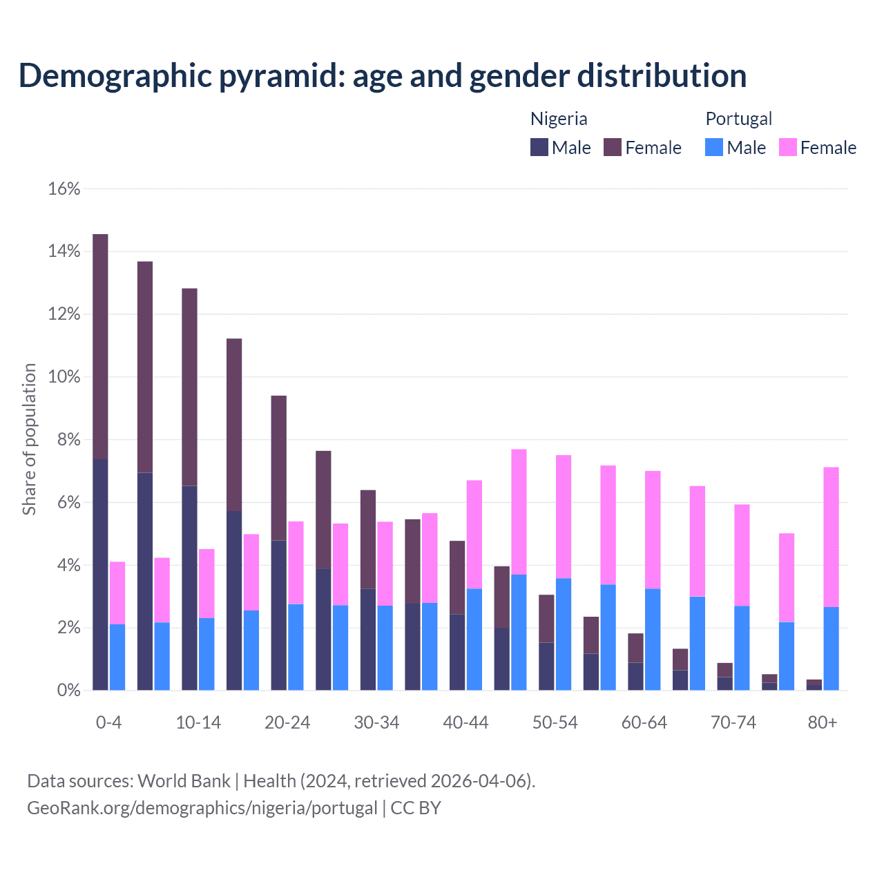 - Nigeria is ranked 178/196 by median age (oldest to youngest) vs 5/196 for Portugal.