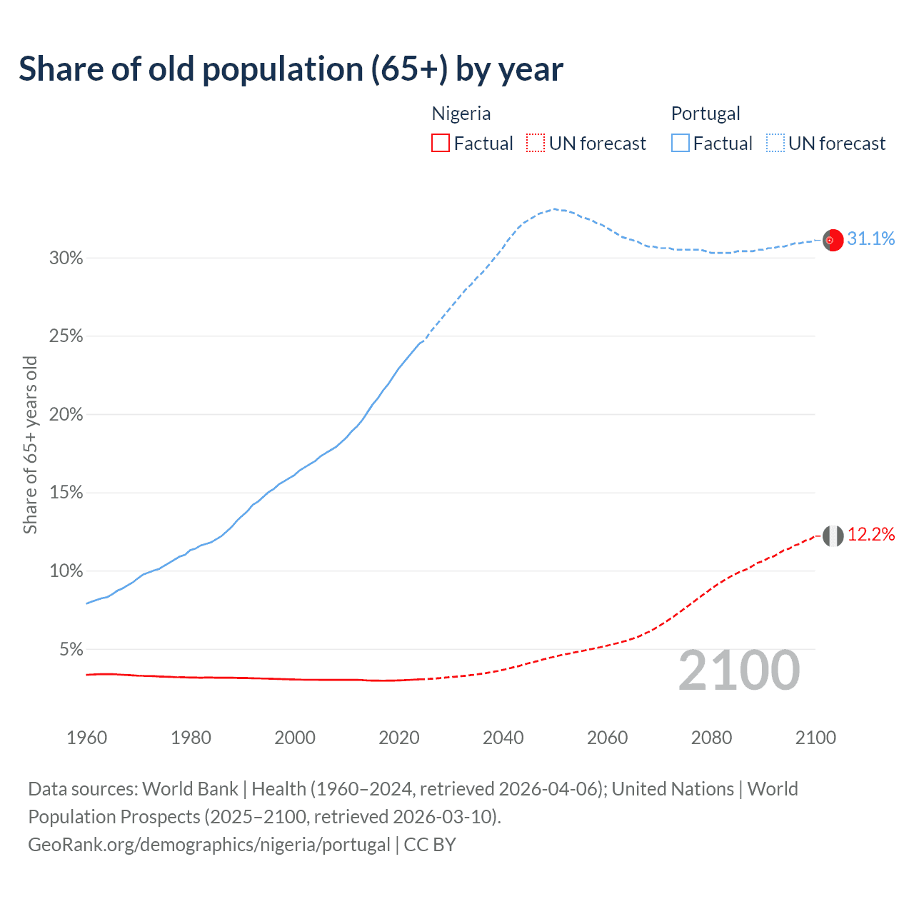 The share of older people aged 65 and over is 3.05% in Nigeria and 24.5% in Portugal. Life expectancy in Nigeria compared to Portugal .