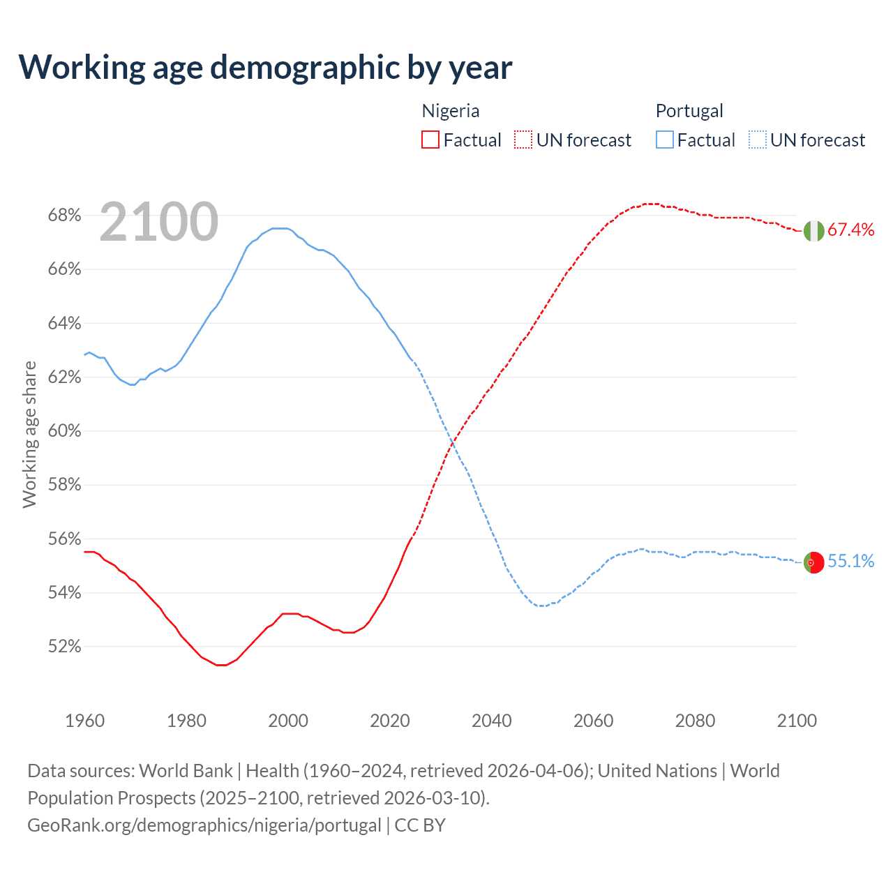 - Nigeria has 136M working age adults (aged 15-64) vs 6.68M in Portugal.