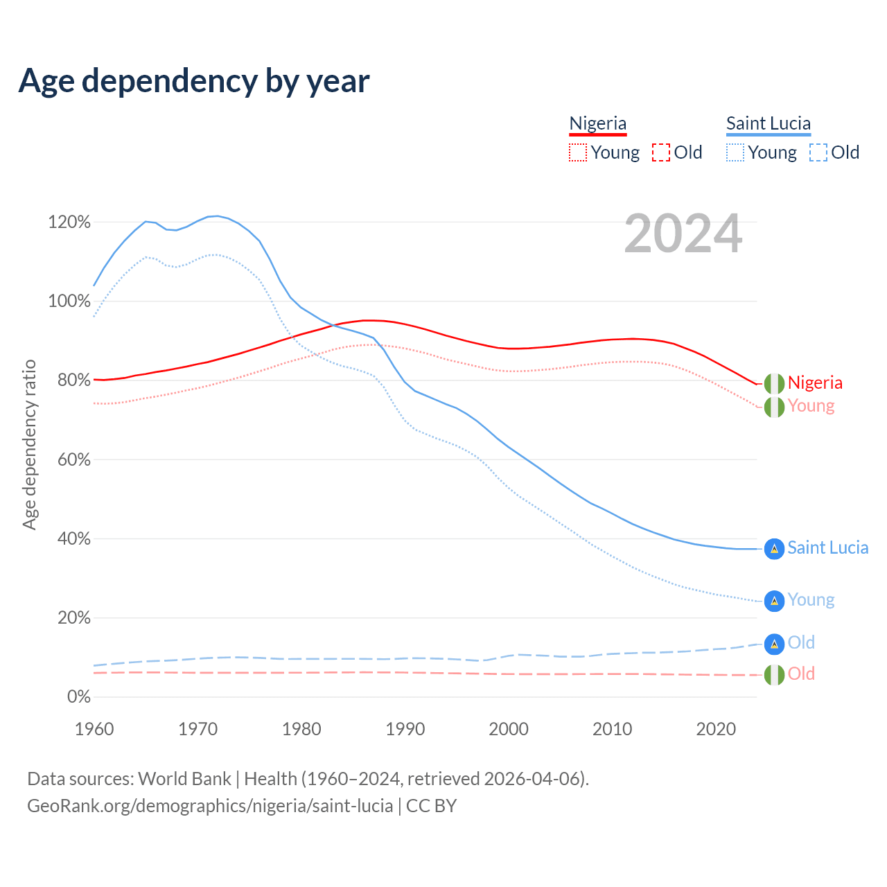 - The share of old-age demographic (65+) in Nigeria is 3.05% vs 9.62% in Saint Lucia.