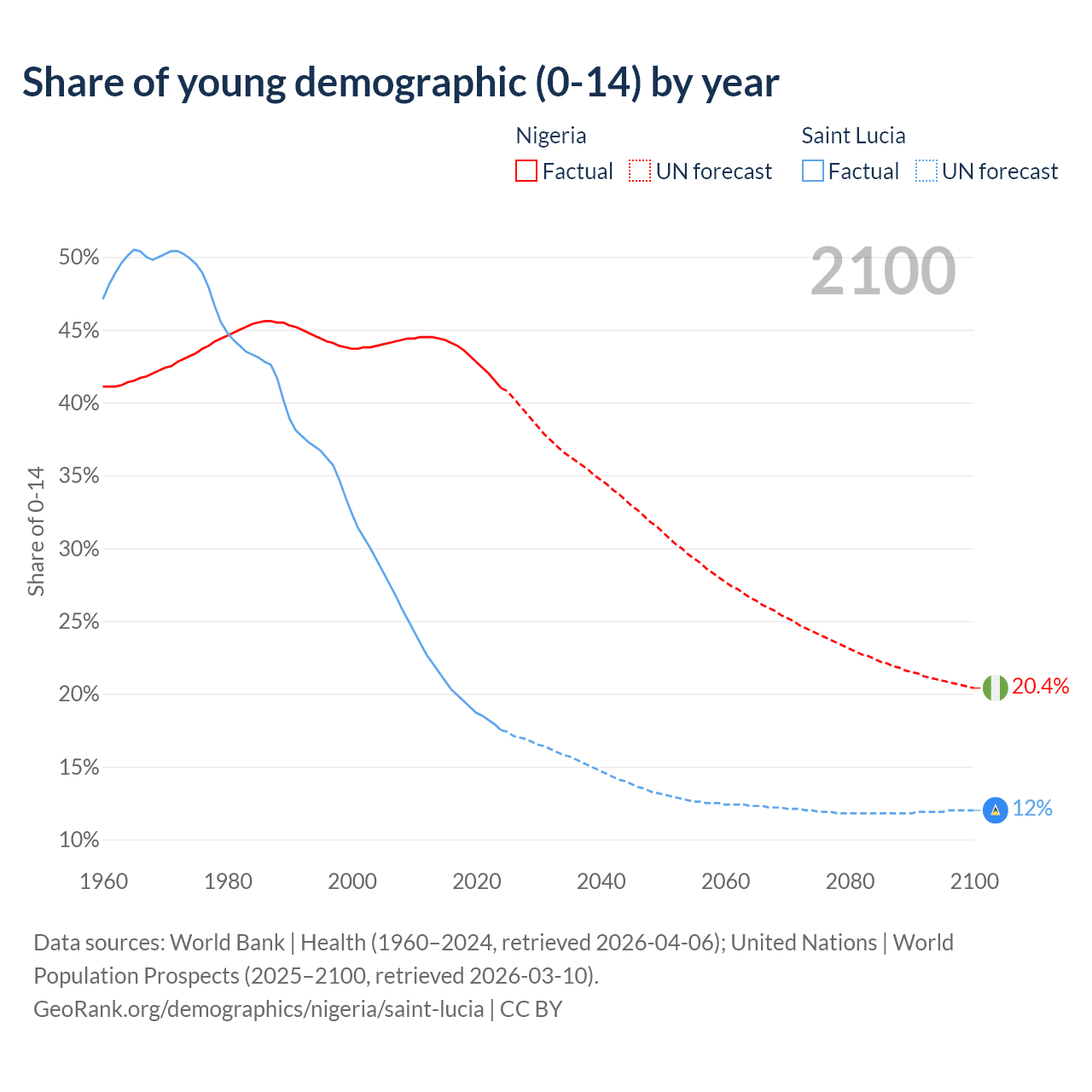 - The share of young demographic (0-15 years old) in Nigeria is 41% vs 17.5% in Saint Lucia.