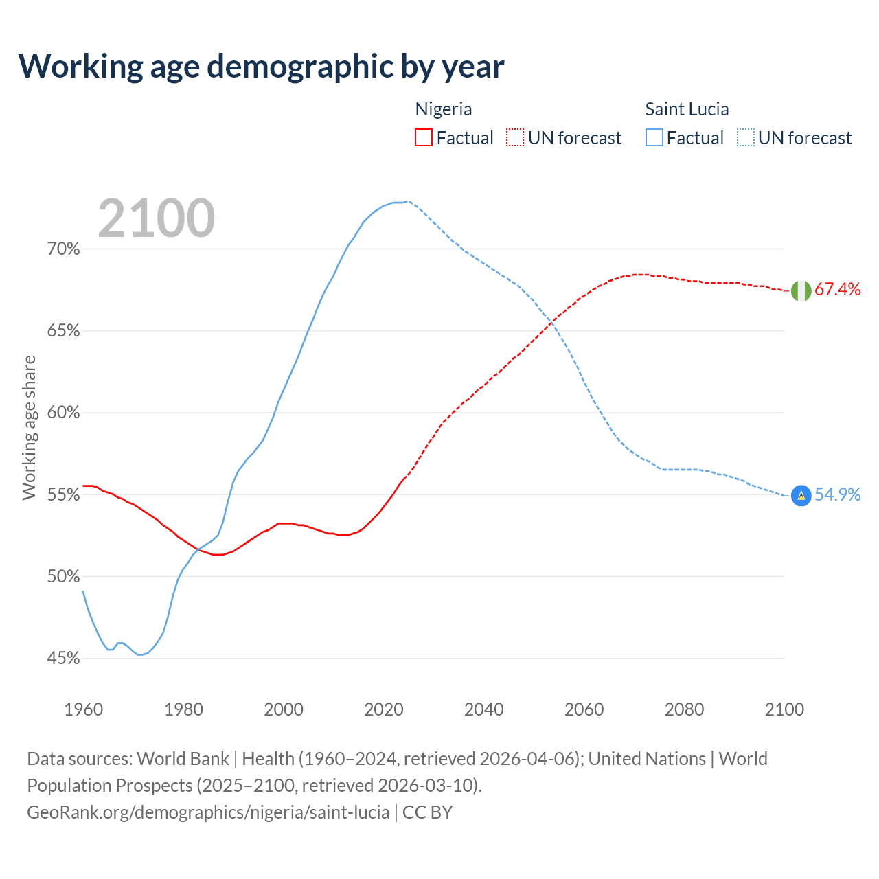 The share of older people aged 65 and over is 3.05% in Nigeria and 9.62% in Saint Lucia. Life expectancy in Nigeria compared to Saint Lucia .