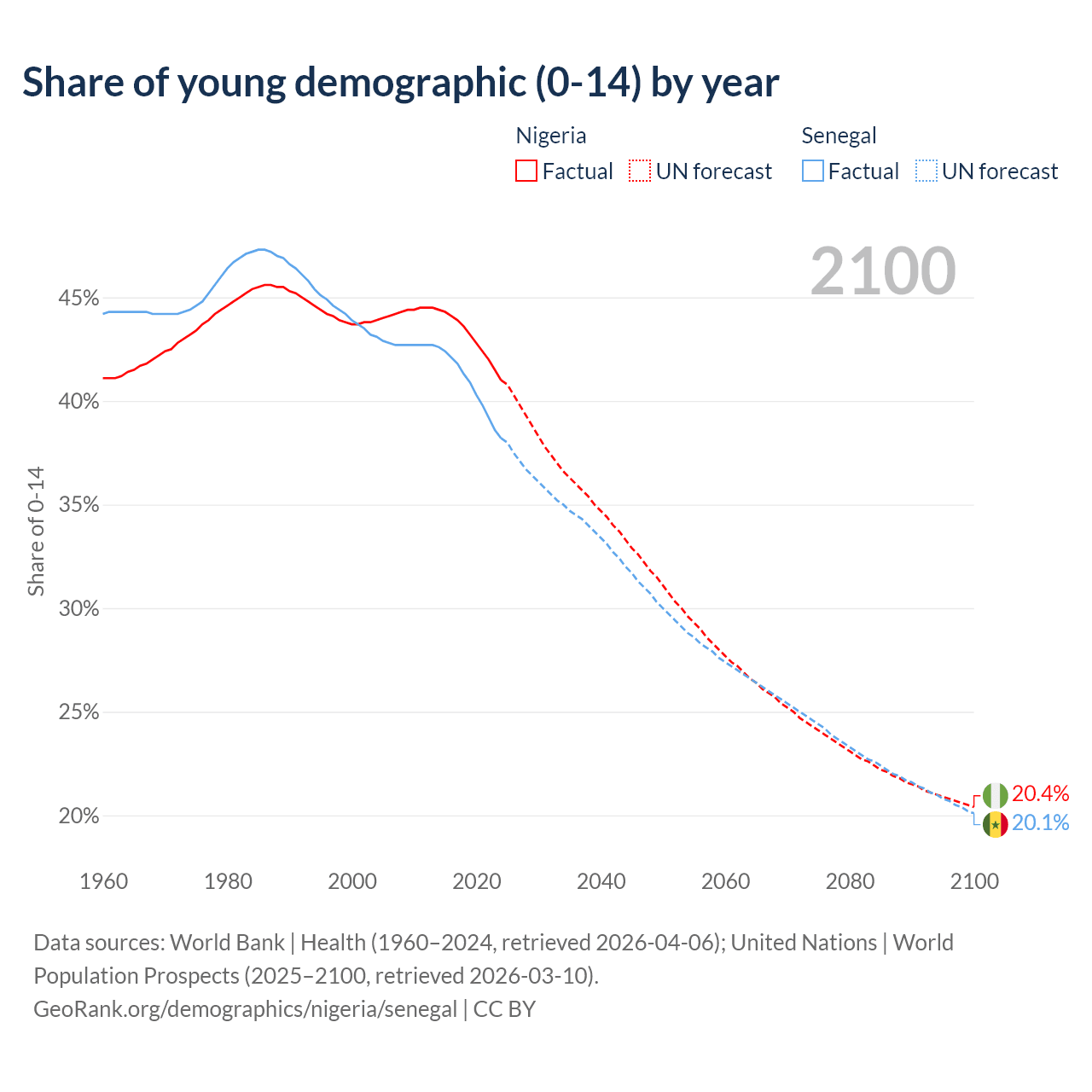 - The share of young demographic (0-15 years old) in Nigeria is 41% vs 38.2% in Senegal.