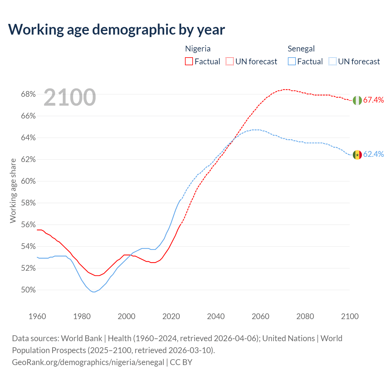 The share of older people aged 65 and over is 3.05% in Nigeria and 3.62% in Senegal. Life expectancy in Nigeria compared to Senegal .