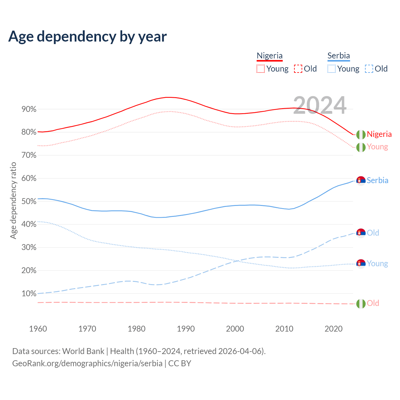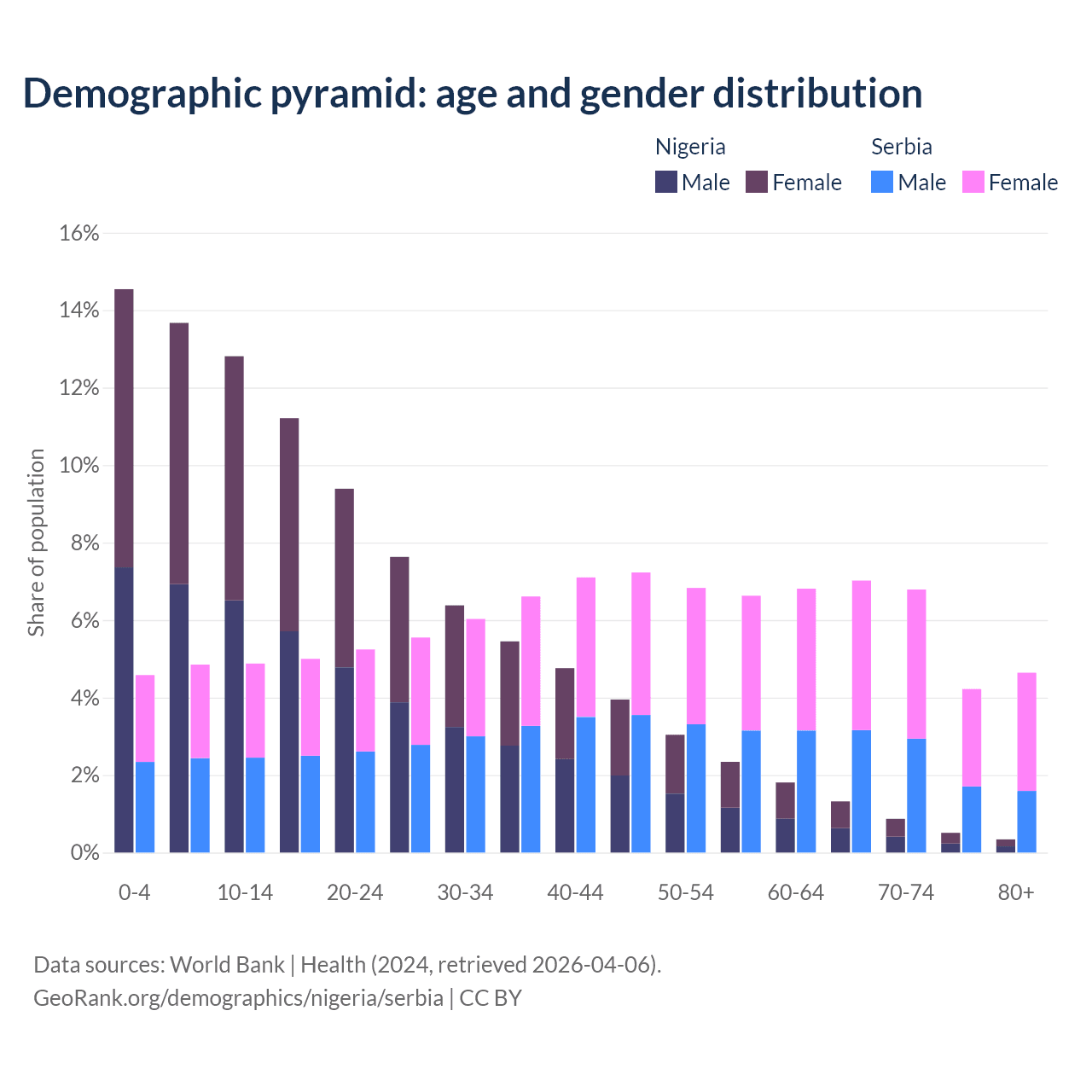 - Nigeria is ranked 178/196 by median age (oldest to youngest) vs 15/196 for Serbia.