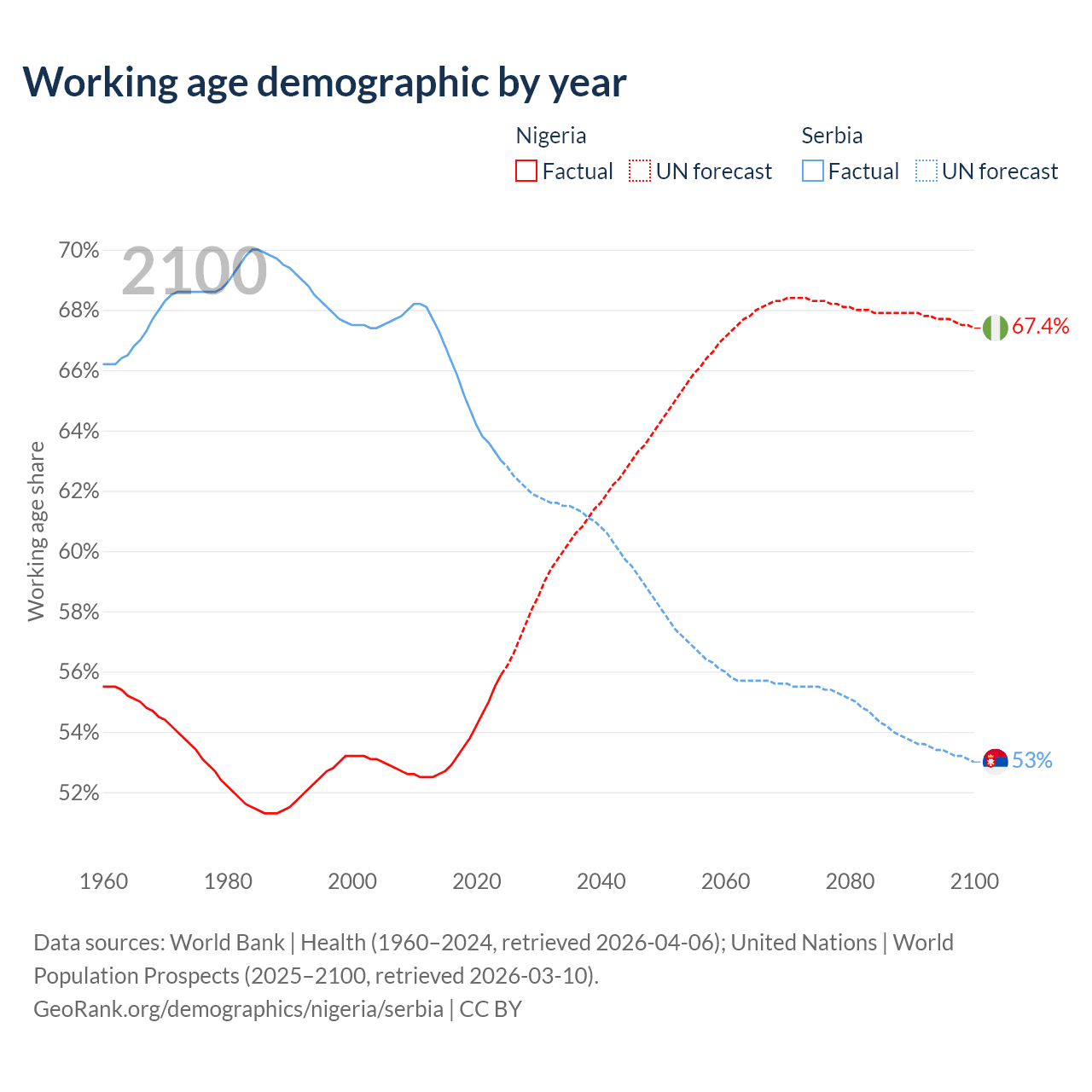 - Nigeria has 136M working age adults (aged 15-64) vs 4.09M in Serbia.