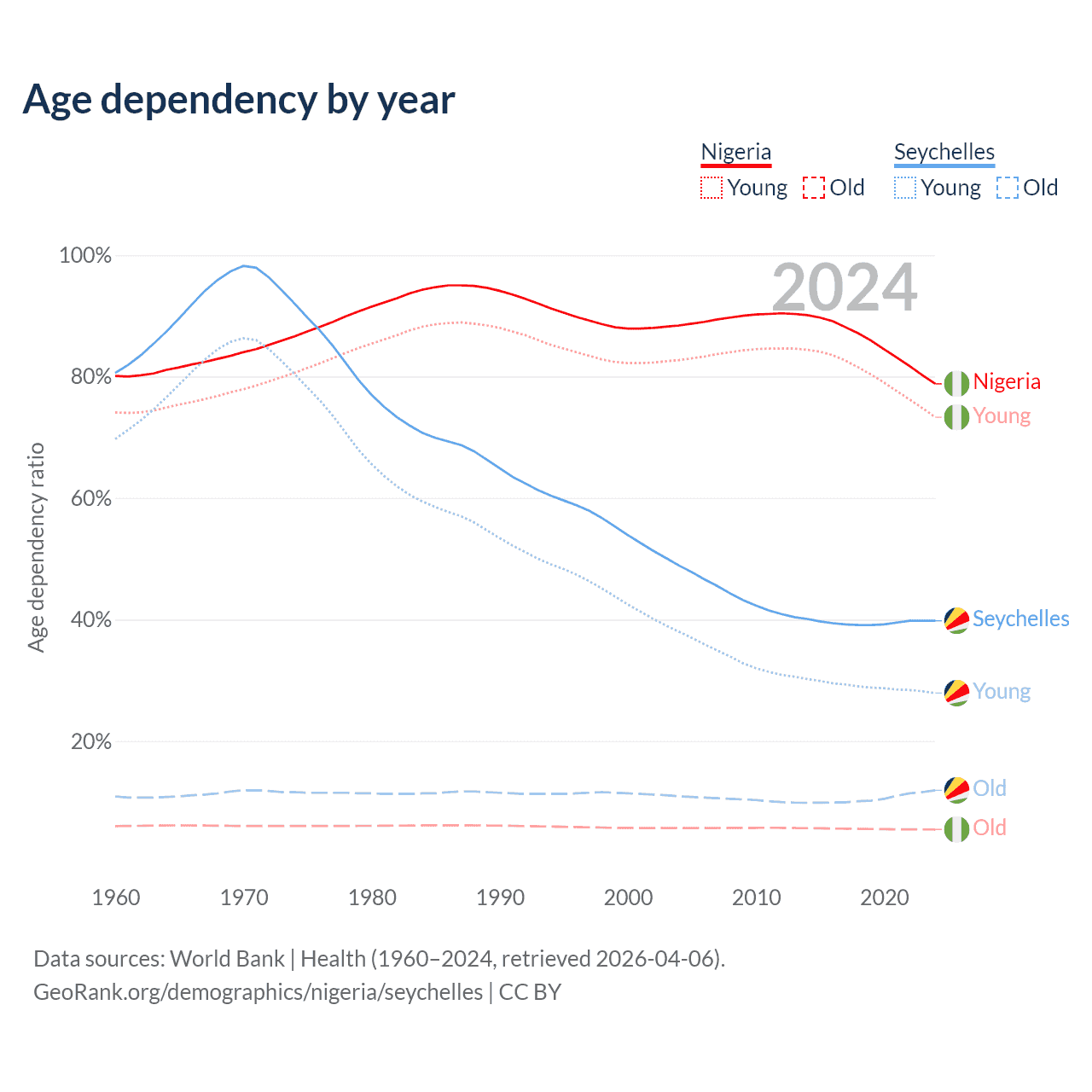 - Nigeria is ranked 178/196 by median age (oldest to youngest) vs 76/196 for the Seychelles.