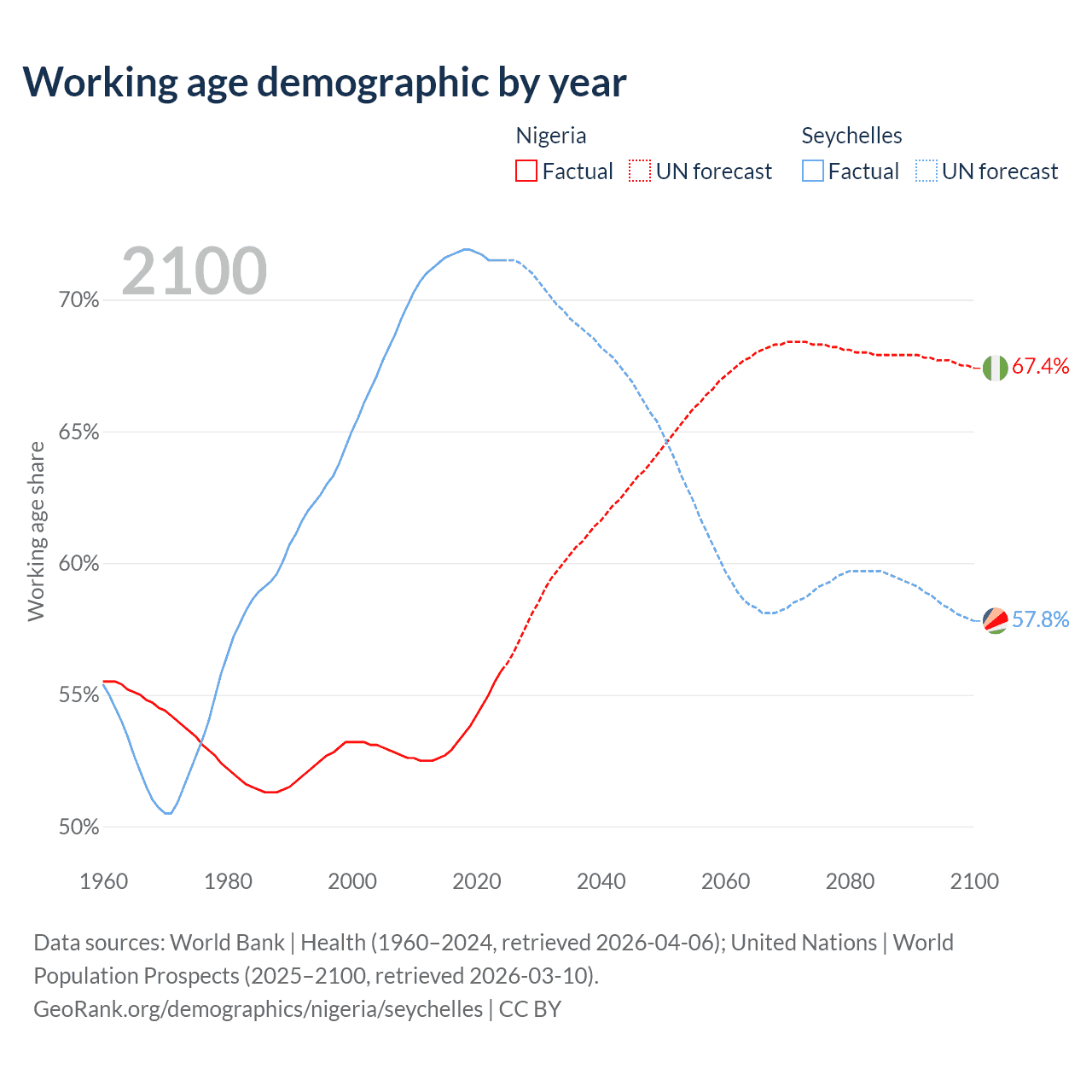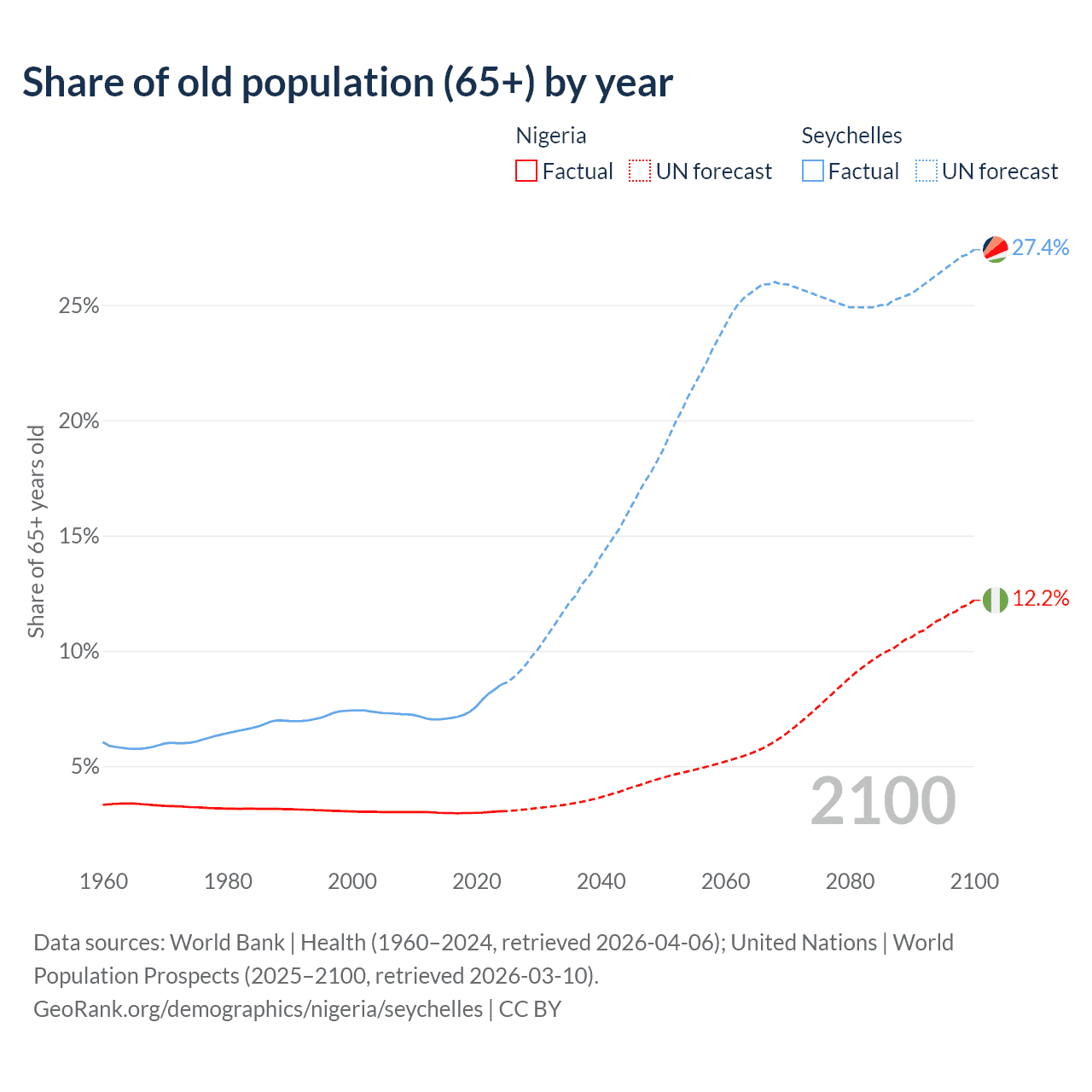 The share of older people aged 65 and over is 3.05% in Nigeria and 8.54% in the Seychelles. Life expectancy in Nigeria compared to the Seychelles .