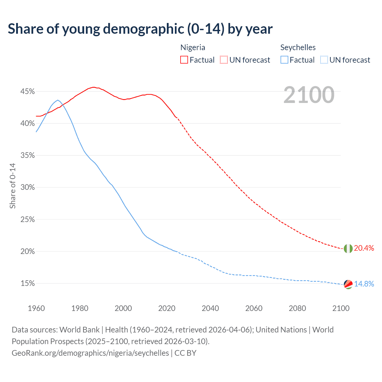 - The share of young demographic (0-15 years old) in Nigeria is 41% vs 20% in the Seychelles.