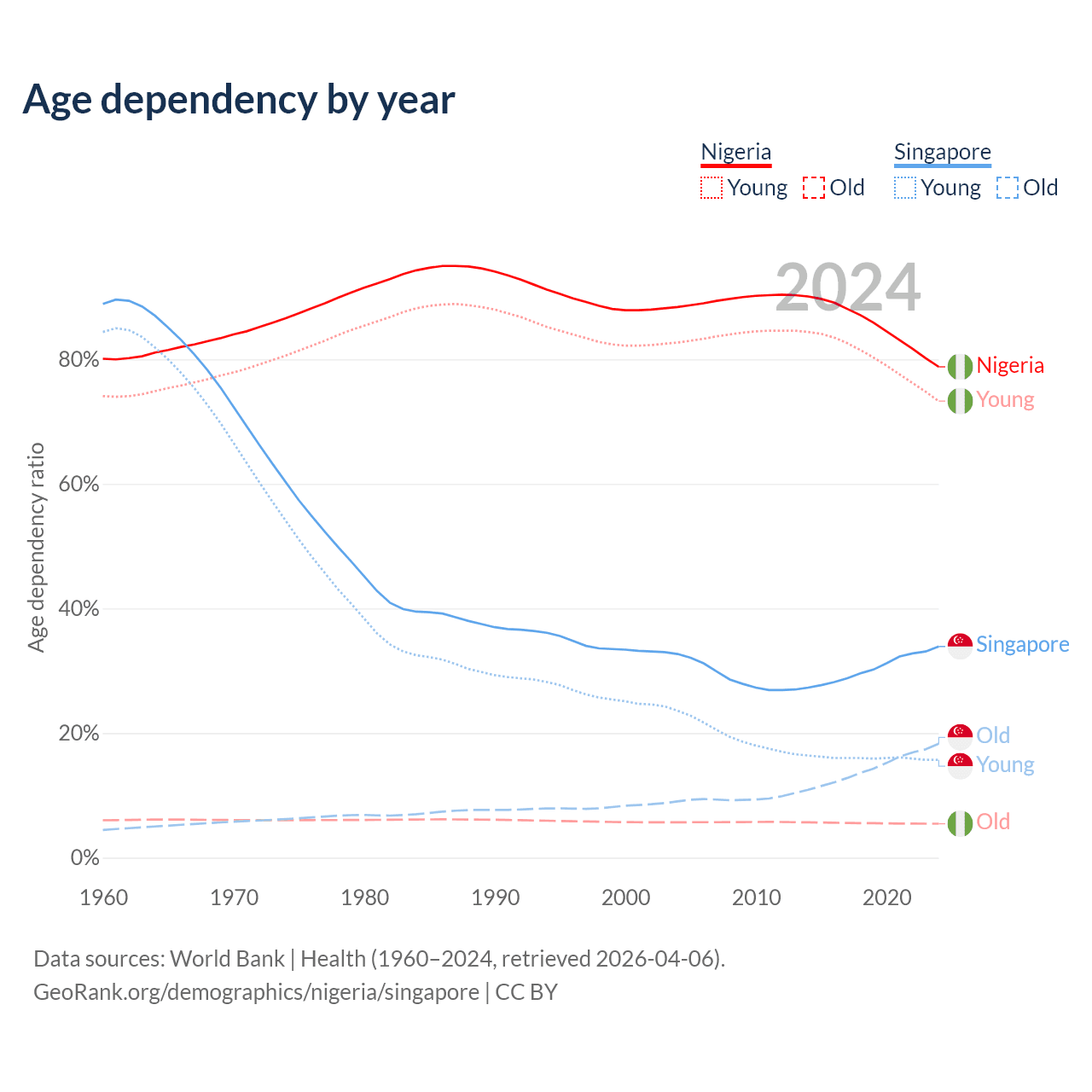 - Nigeria is ranked 178/196 by median age (oldest to youngest) vs 68/196 for Singapore.