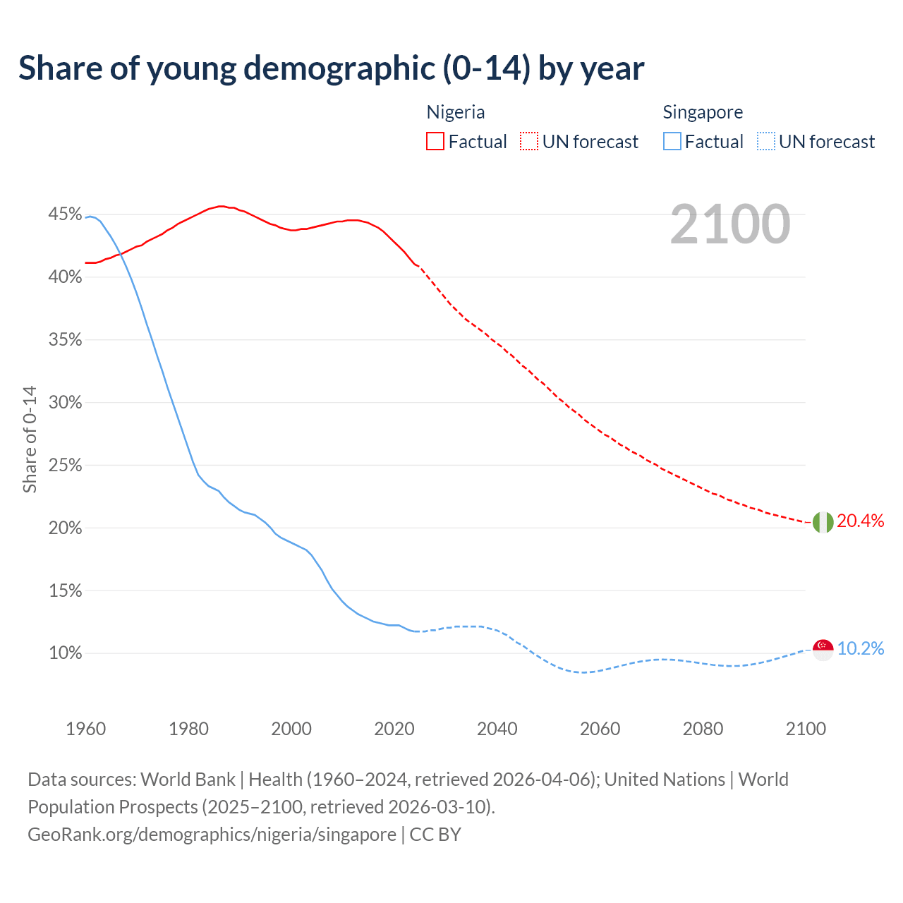 Median age Nigeria vs Singapore, 1960-2100