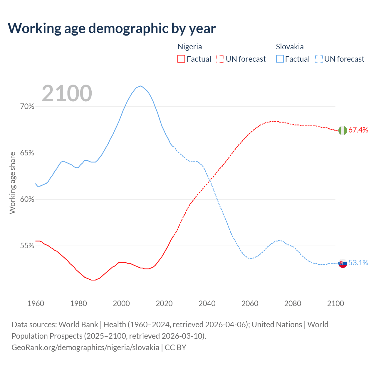 - Nigeria has 136M working age adults (aged 15-64) vs 3.52M in Slovakia.