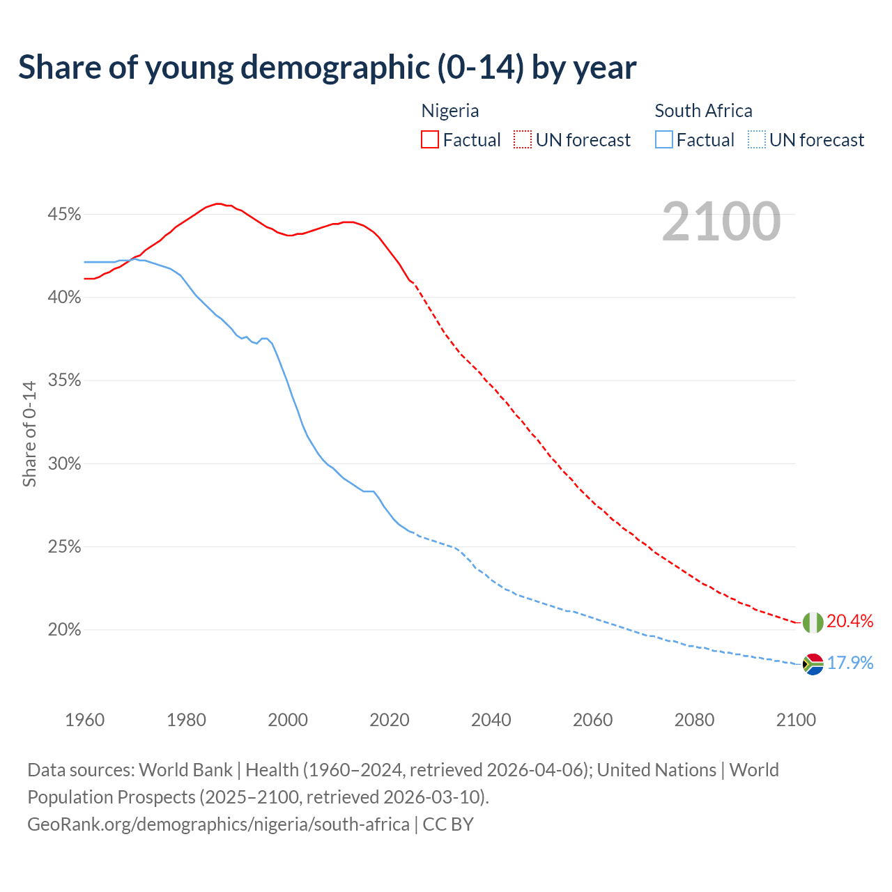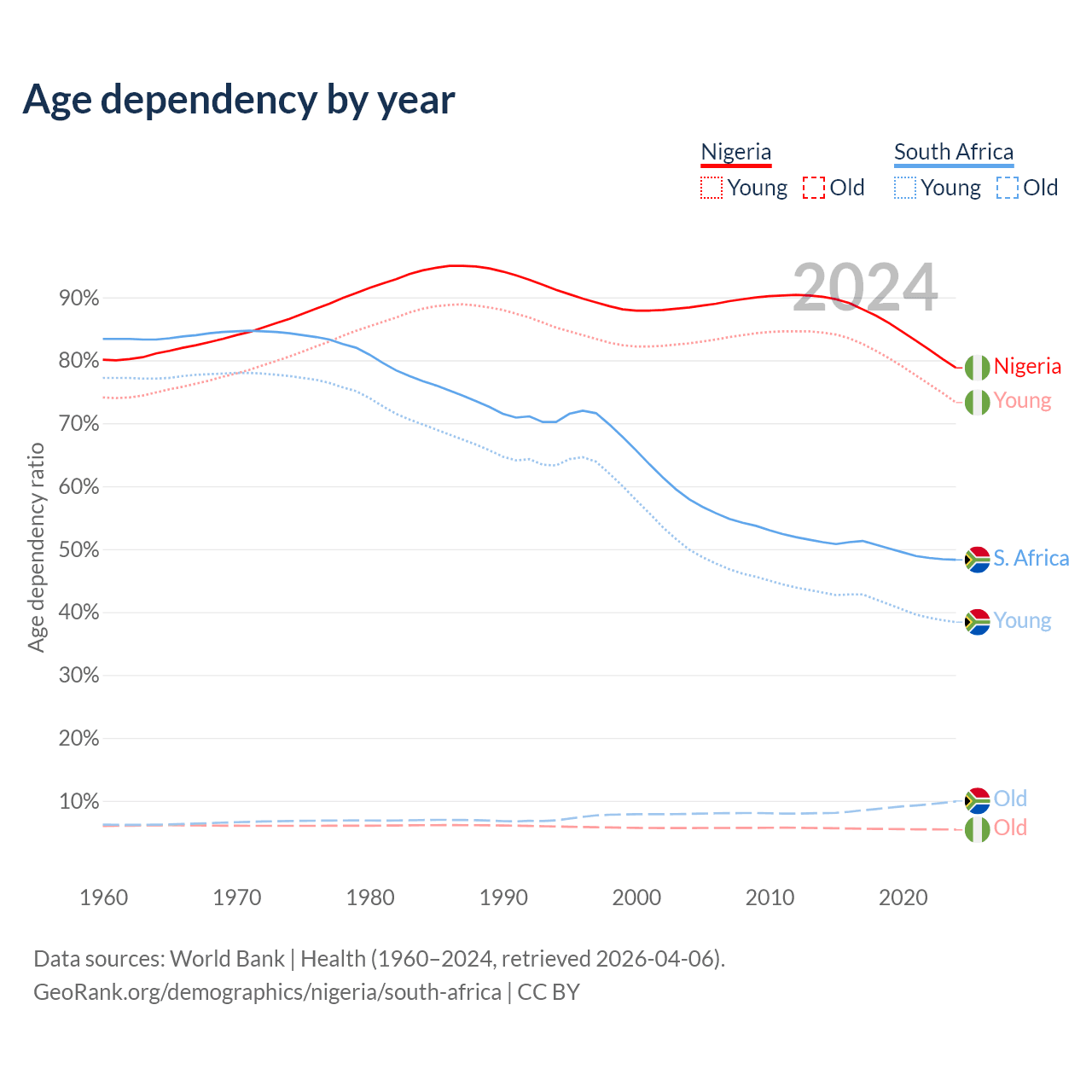 - Nigeria is ranked 178/196 by median age (oldest to youngest) vs 107/196 for South Africa.