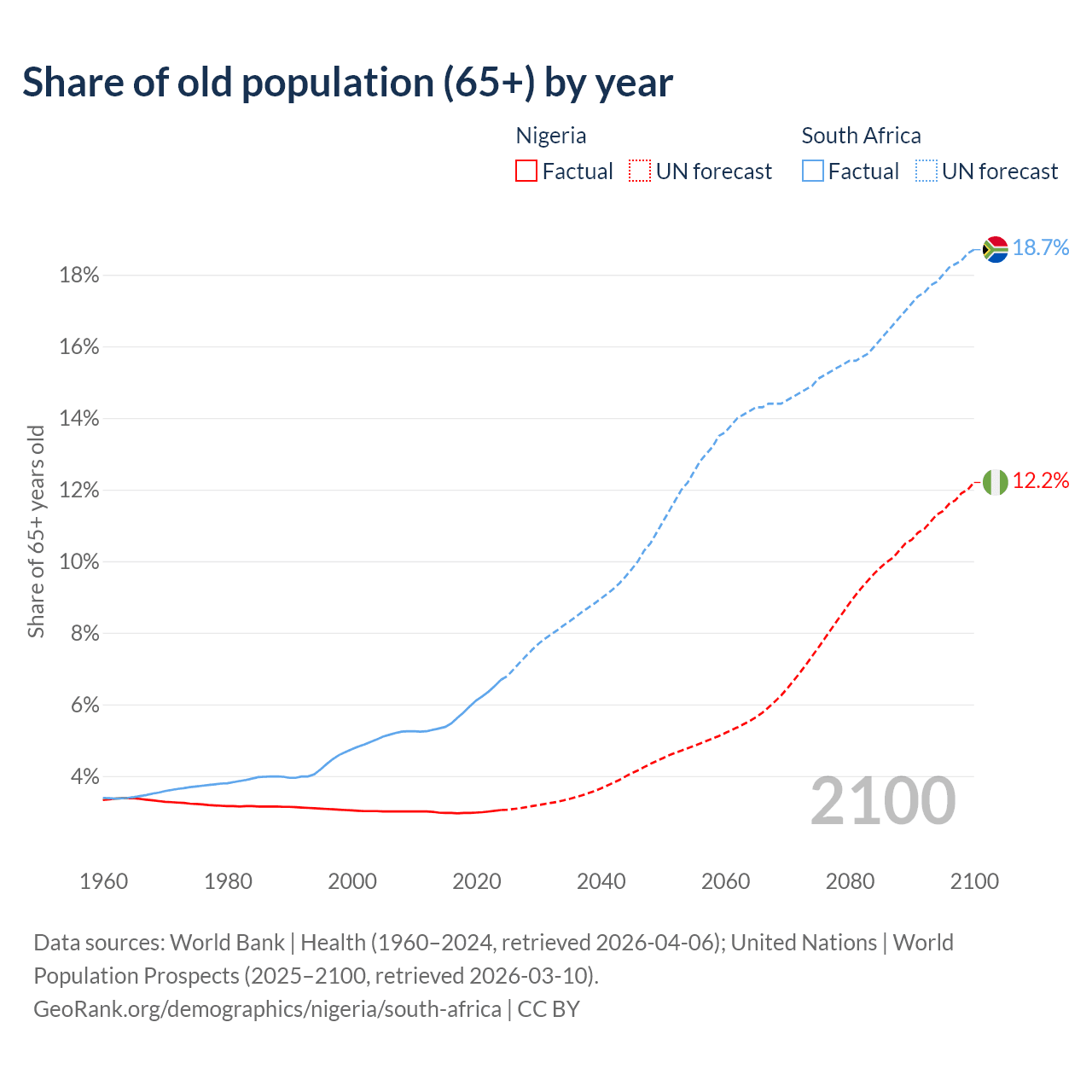 The share of older people aged 65 and over is 3.05% in Nigeria and 6.69% in South Africa. Life expectancy in Nigeria compared to South Africa .