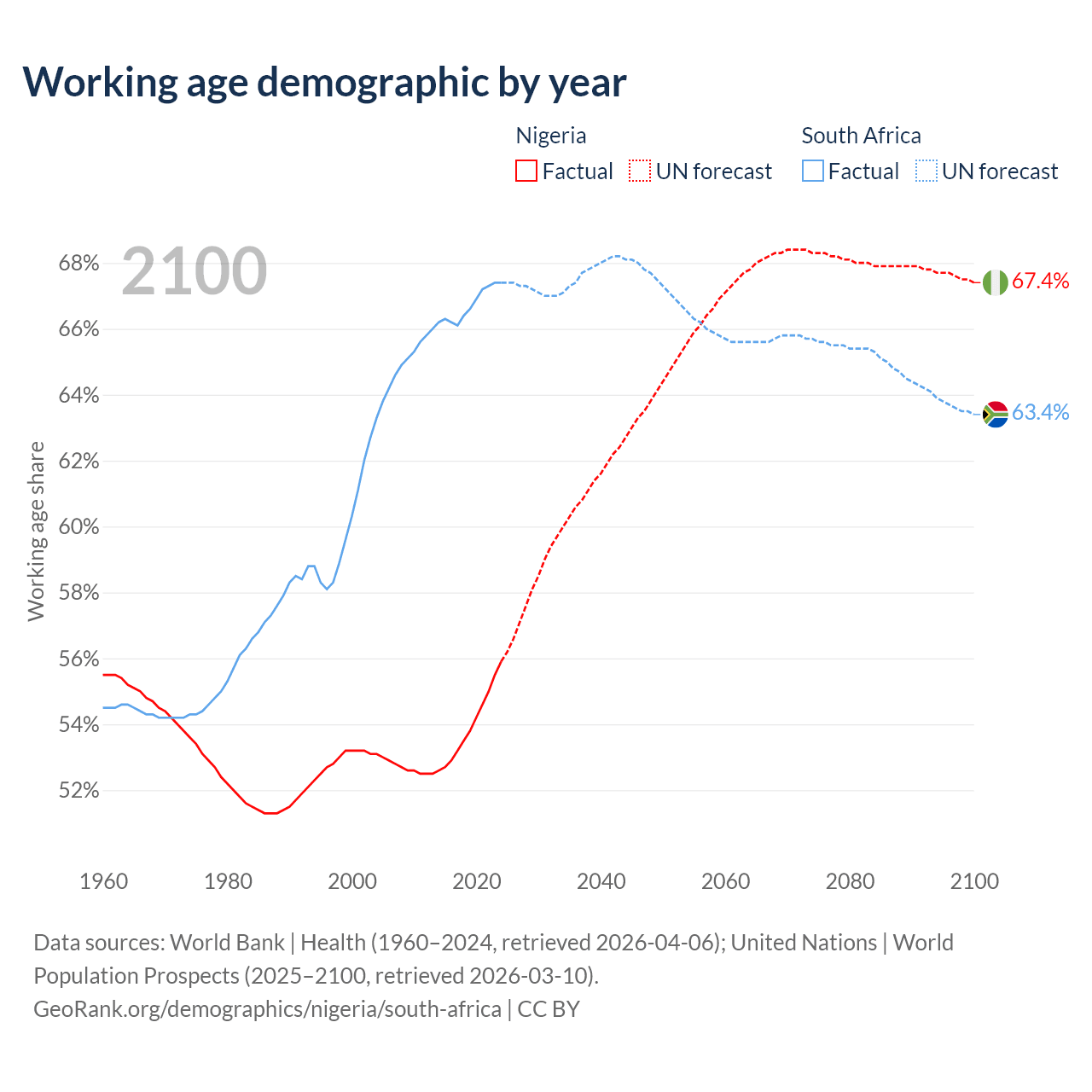 - Nigeria has 136M working age adults (aged 15-64) vs 44.3M in South Africa.