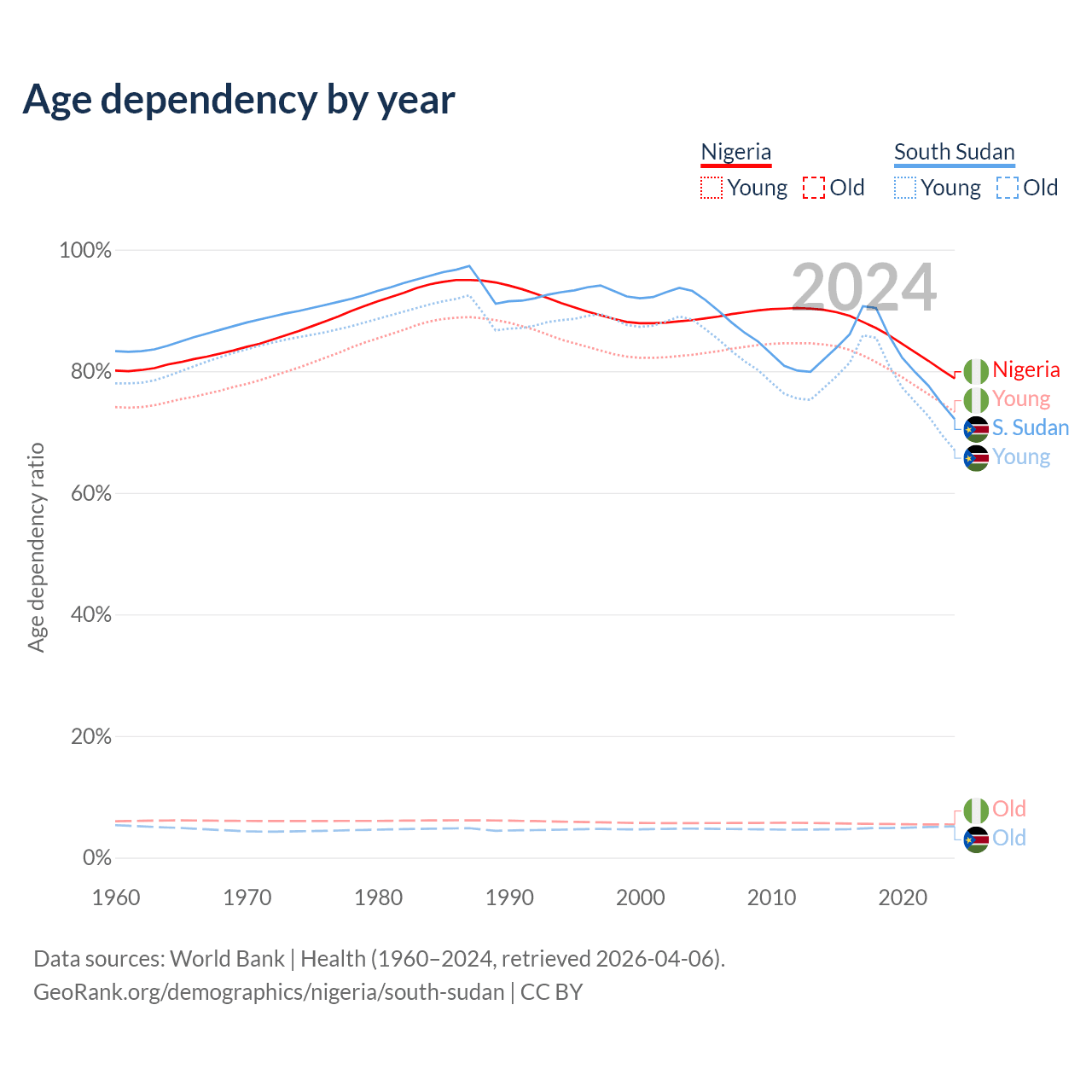 - Nigeria is ranked 178/196 by median age (oldest to youngest) vs 173/196 for South Sudan.