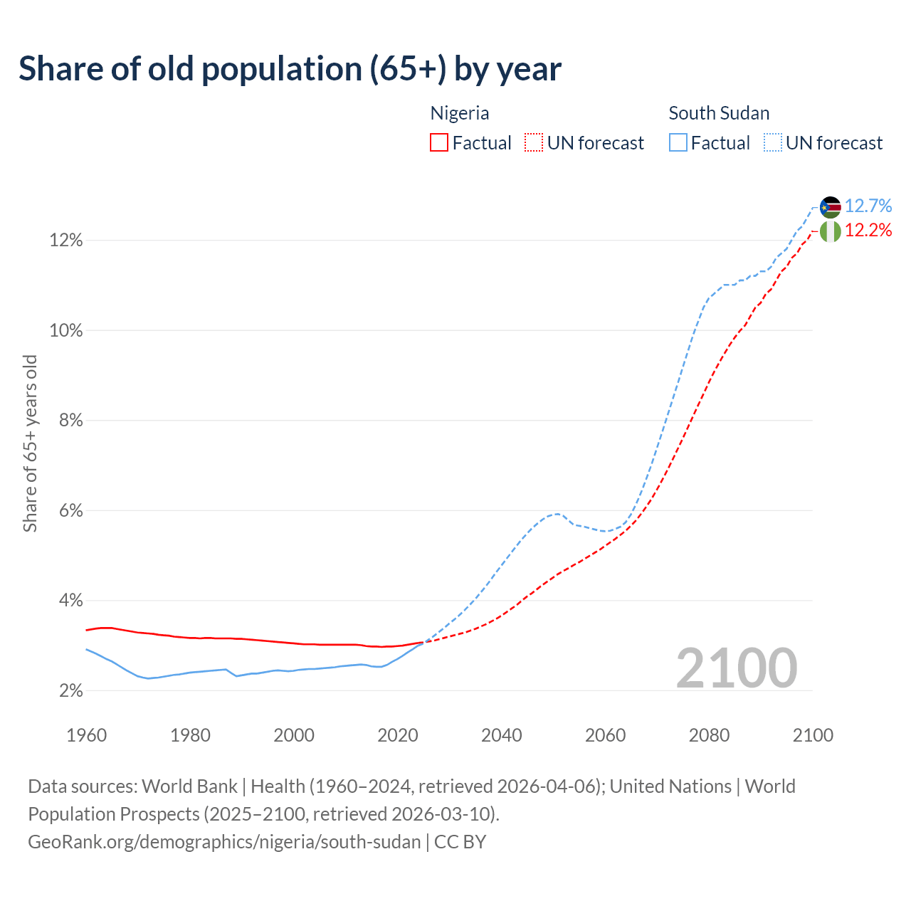 - The share of old-age demographic (65+) in Nigeria is 3.05% vs 2.99% in South Sudan.