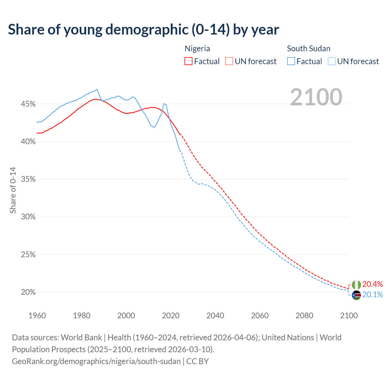 - The share of young demographic (0-15 years old) in Nigeria is 41% vs 38.9% in South Sudan.