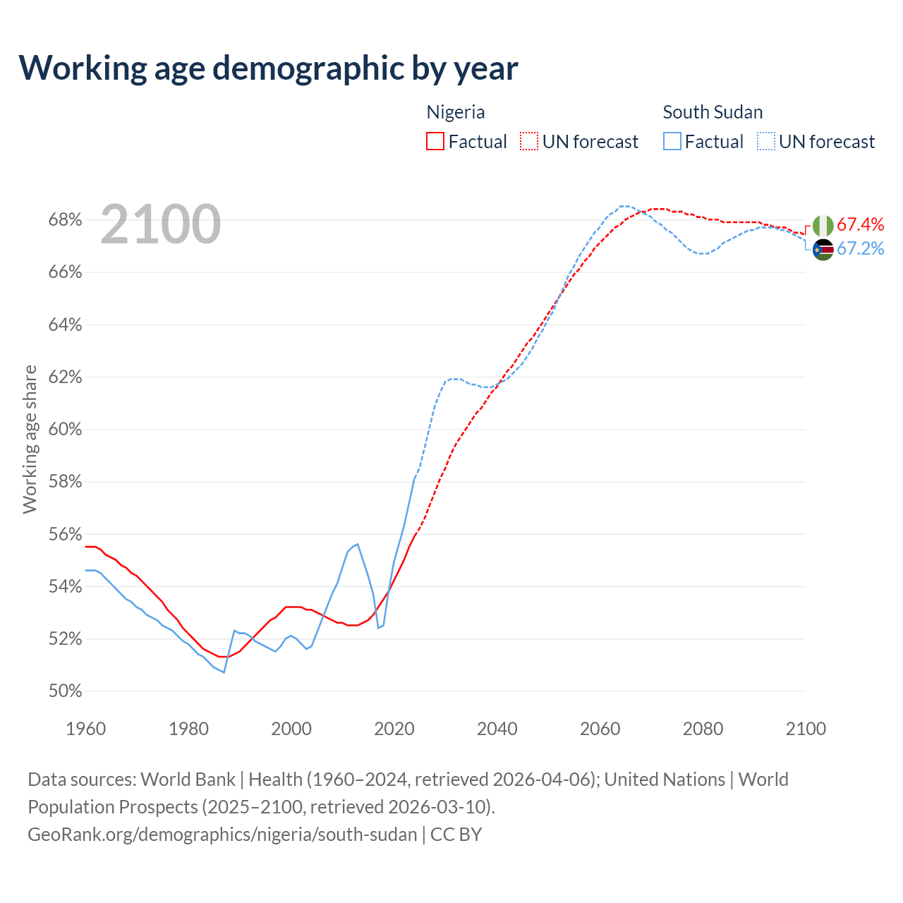 - Nigeria has 136M working age adults (aged 15-64) vs 7.27M in South Sudan.