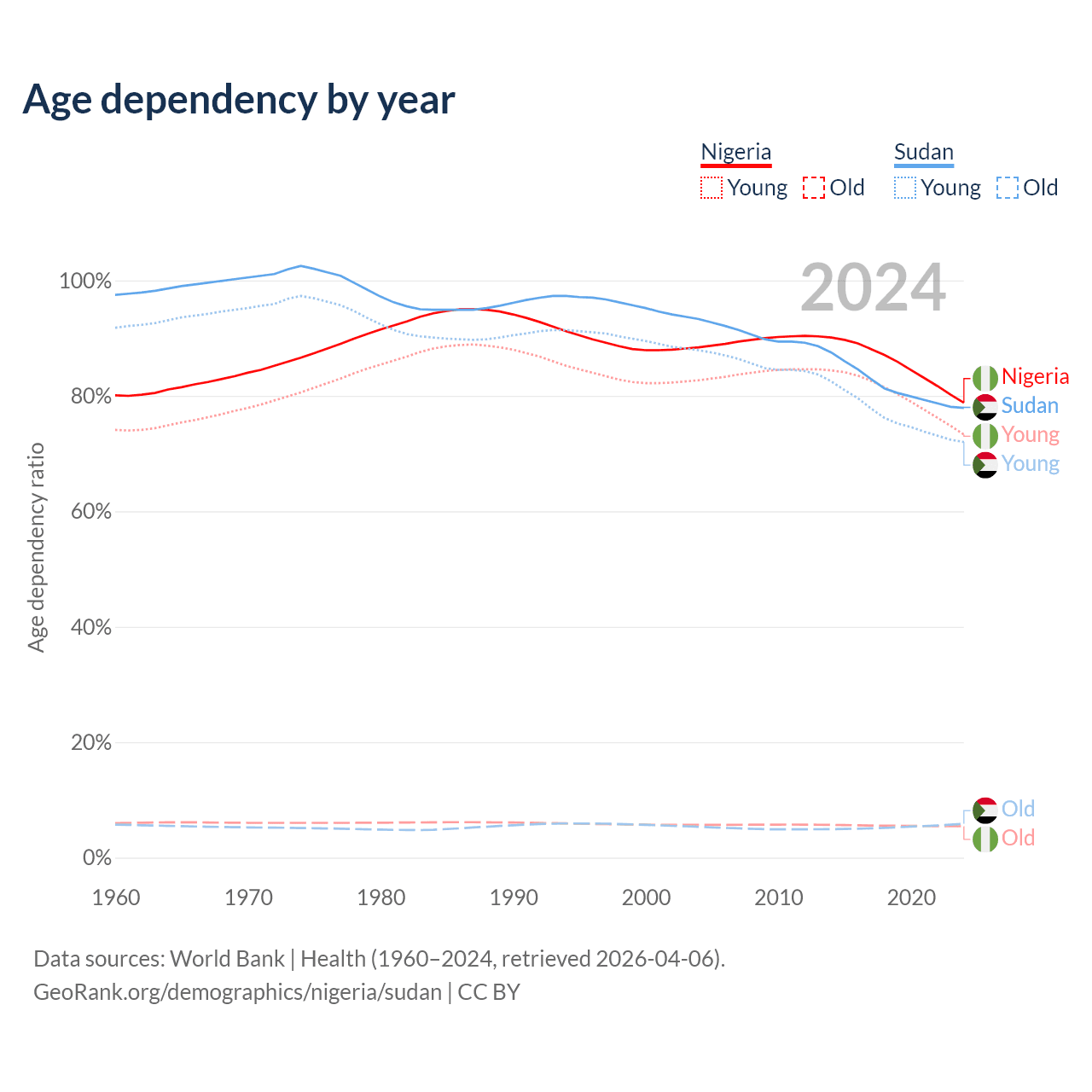 - Nigeria is ranked 178/196 by median age (oldest to youngest) vs 172/196 for Sudan.