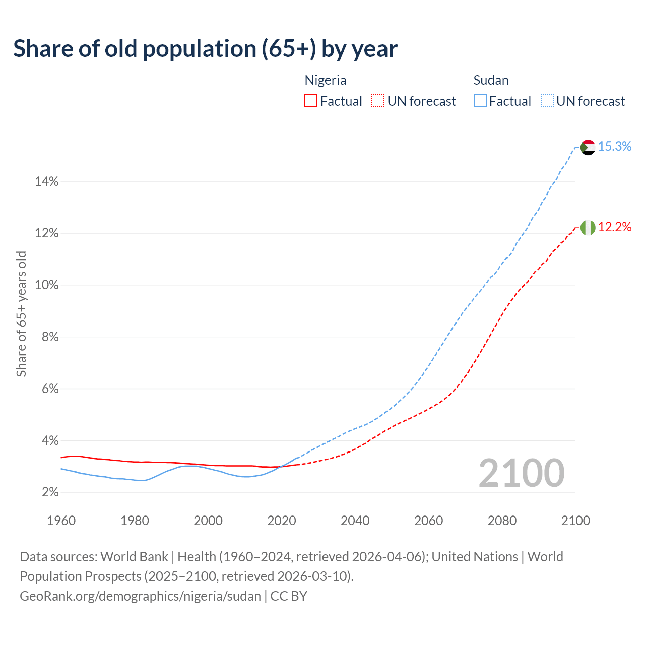 The share of older people aged 65 and over is 3.05% in Nigeria and 3.3% in Sudan. Life expectancy in Nigeria compared to Sudan .