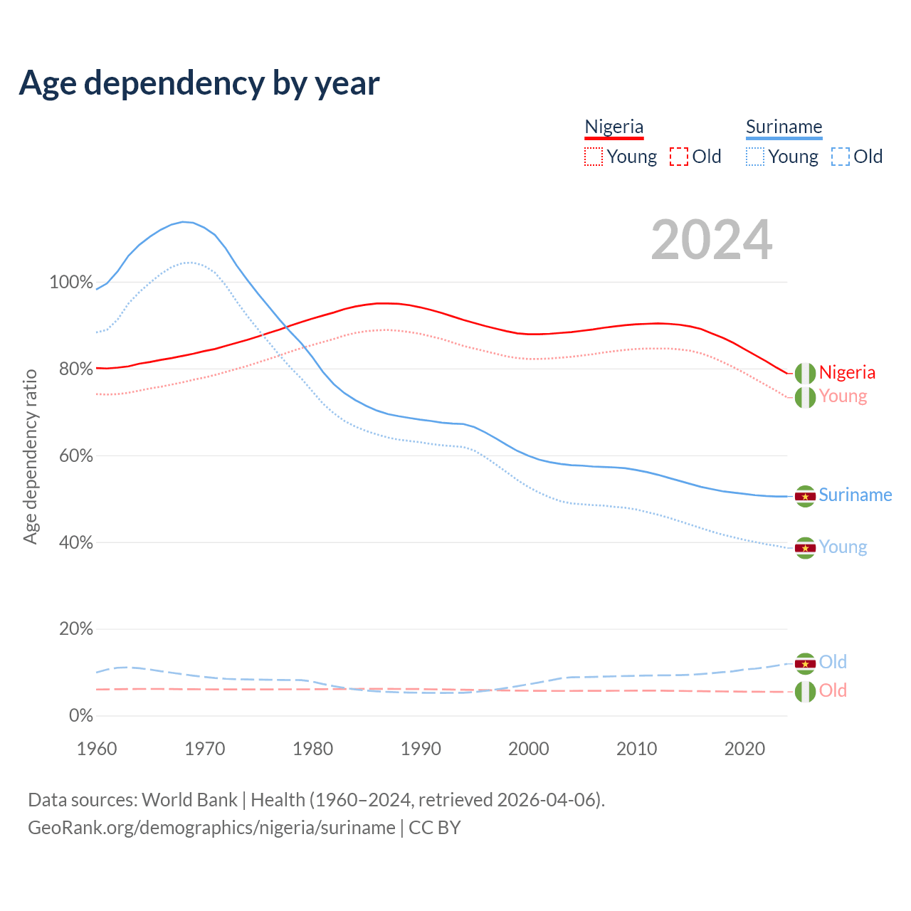 - Nigeria is ranked 178/196 by median age (oldest to youngest) vs 109/196 for Suriname.