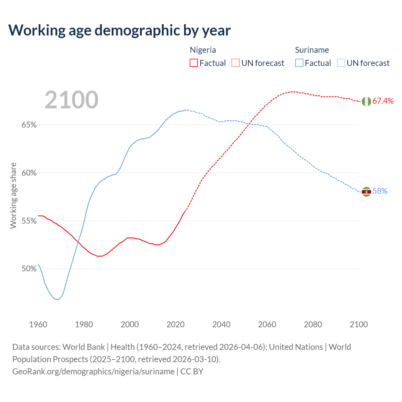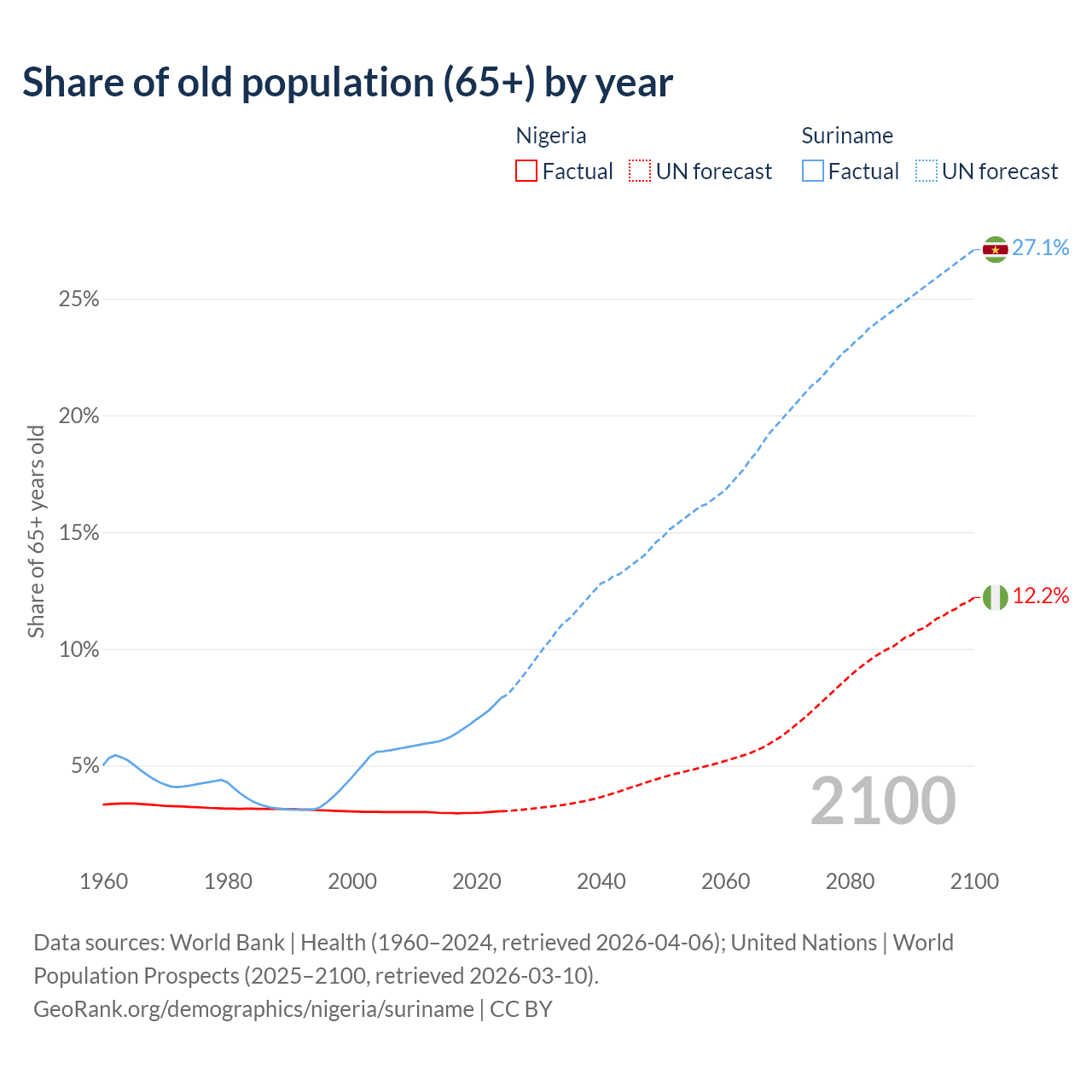 The share of older people aged 65 and over is 3.05% in Nigeria and 7.9% in Suriname. Life expectancy in Nigeria compared to Suriname .