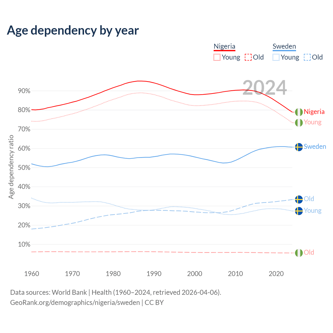 - Nigeria is ranked 178/196 by median age (oldest to youngest) vs 39/196 for Sweden.