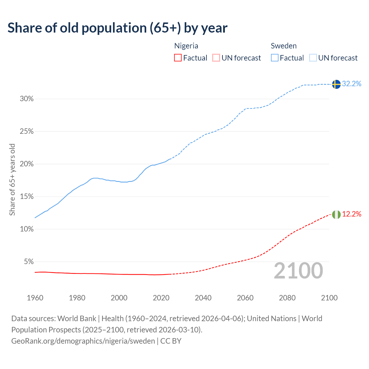 The share of older people aged 65 and over is 3.05% in Nigeria and 20.7% in Sweden. Life expectancy in Nigeria compared to Sweden .
