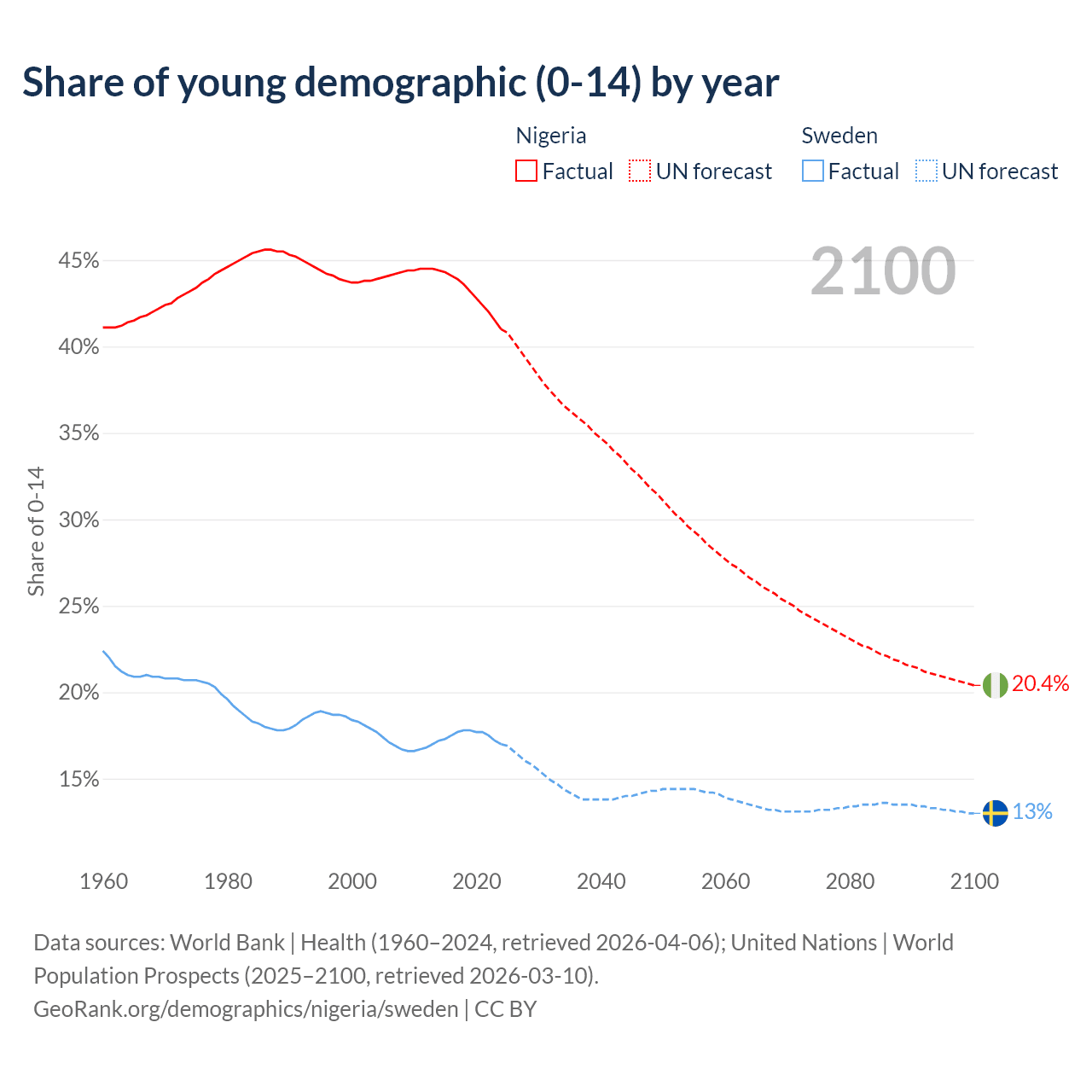 - The share of young demographic (0-15 years old) in Nigeria is 41% vs 17% in Sweden.