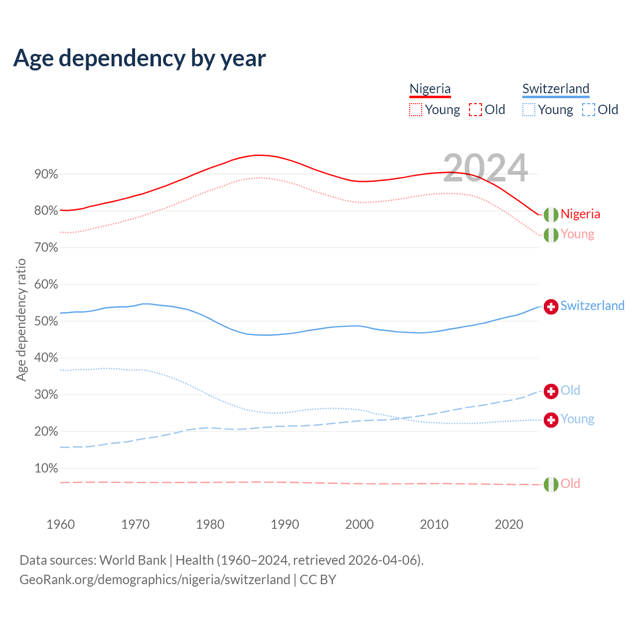 The share of older people aged 65 and over is 3.05% in Nigeria and 20% in Switzerland. Life expectancy in Nigeria compared to Switzerland .