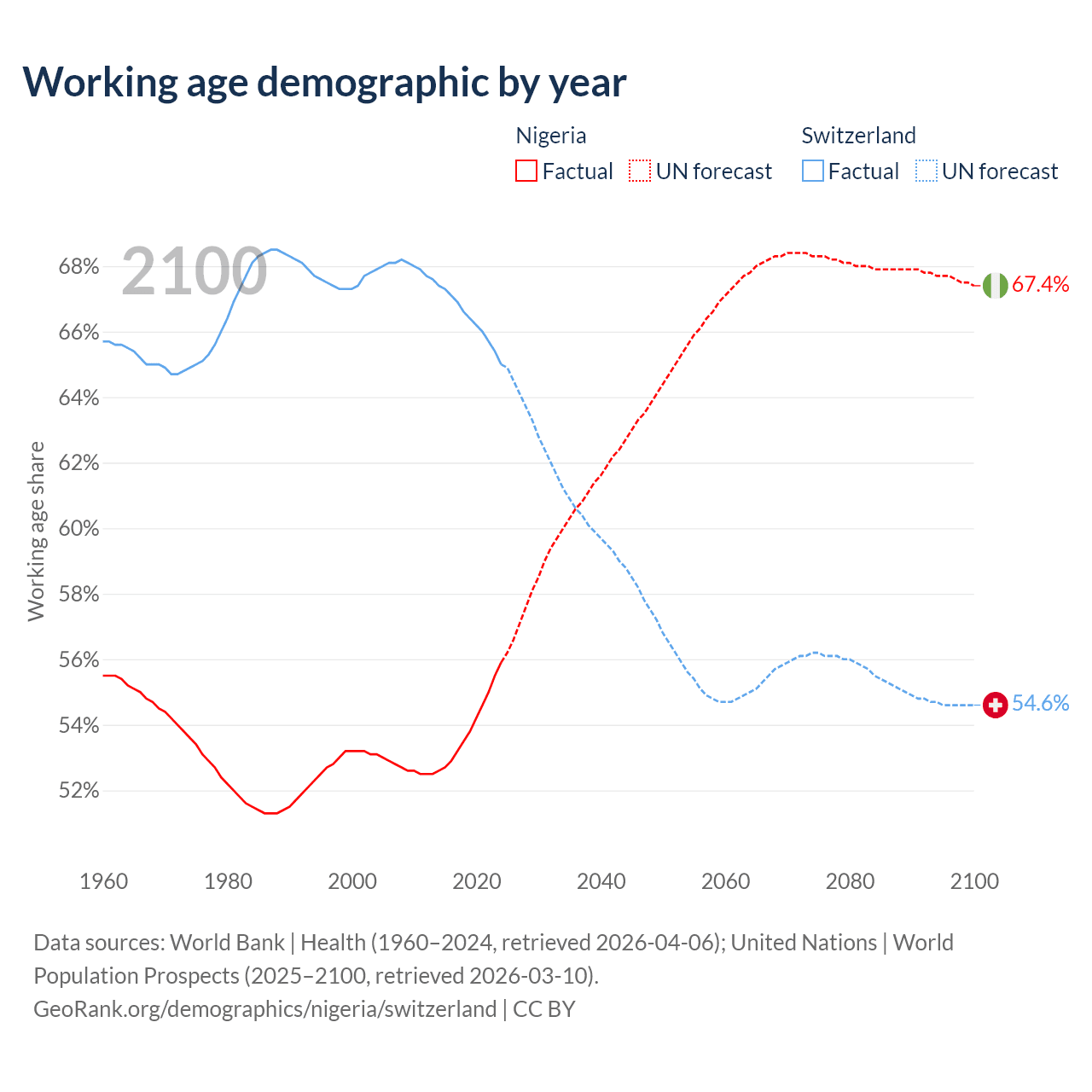 - Nigeria has 136M working age adults (aged 15-64) vs 5.92M in Switzerland.