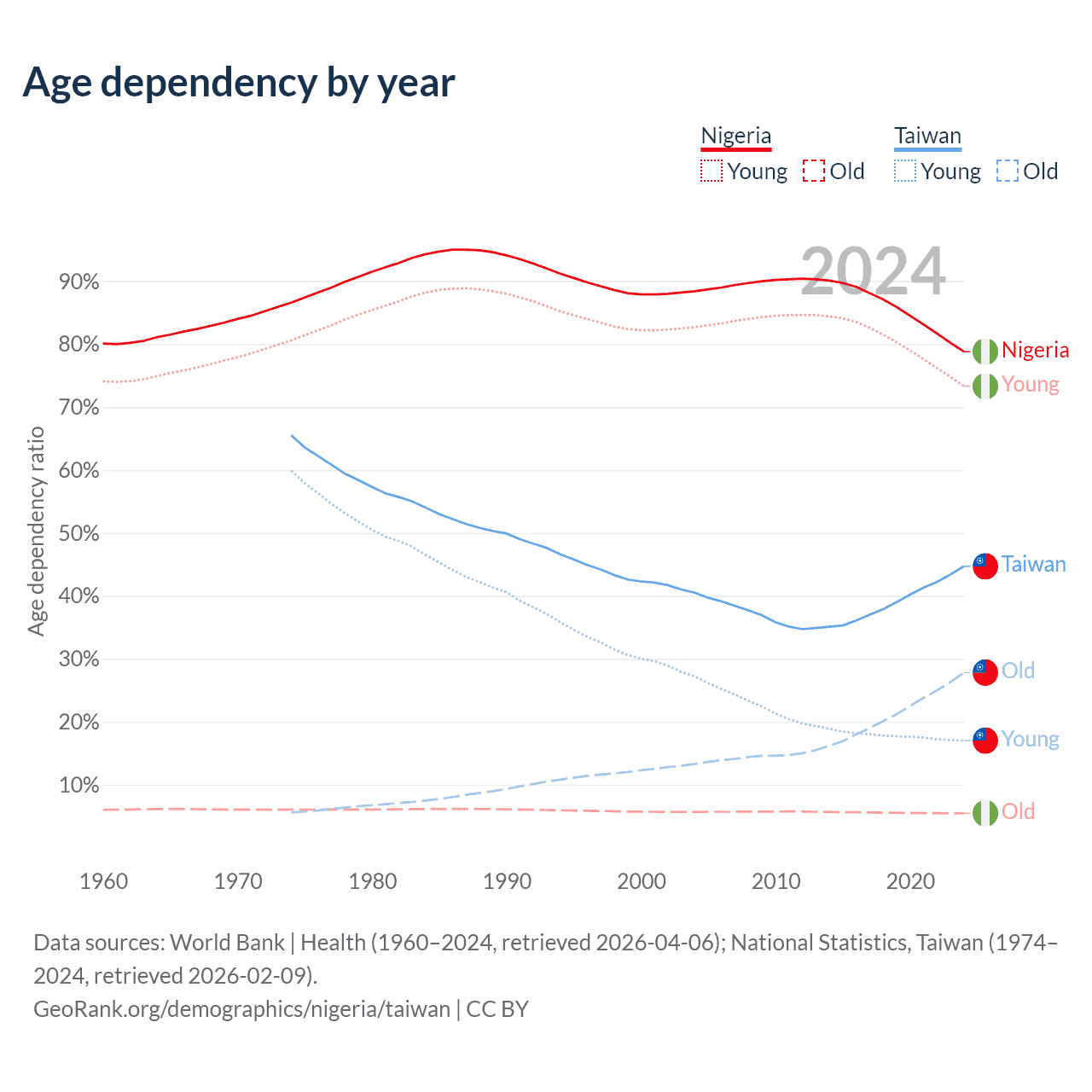 Data sources: World Bank | Health (1960–2024, retrieved 2026-04-06); U.S. Census Bureau (1960–2024, retrieved 2026-02-08); National Statistics, Taiwan (1974–2024, retrieved 2026-02-09).