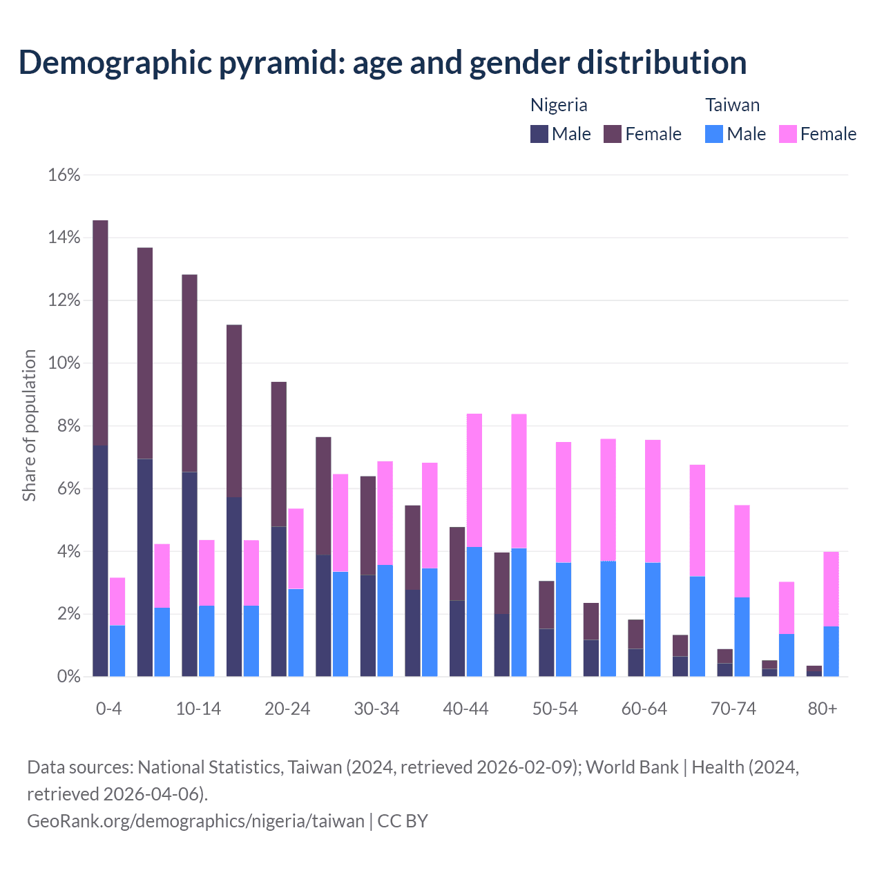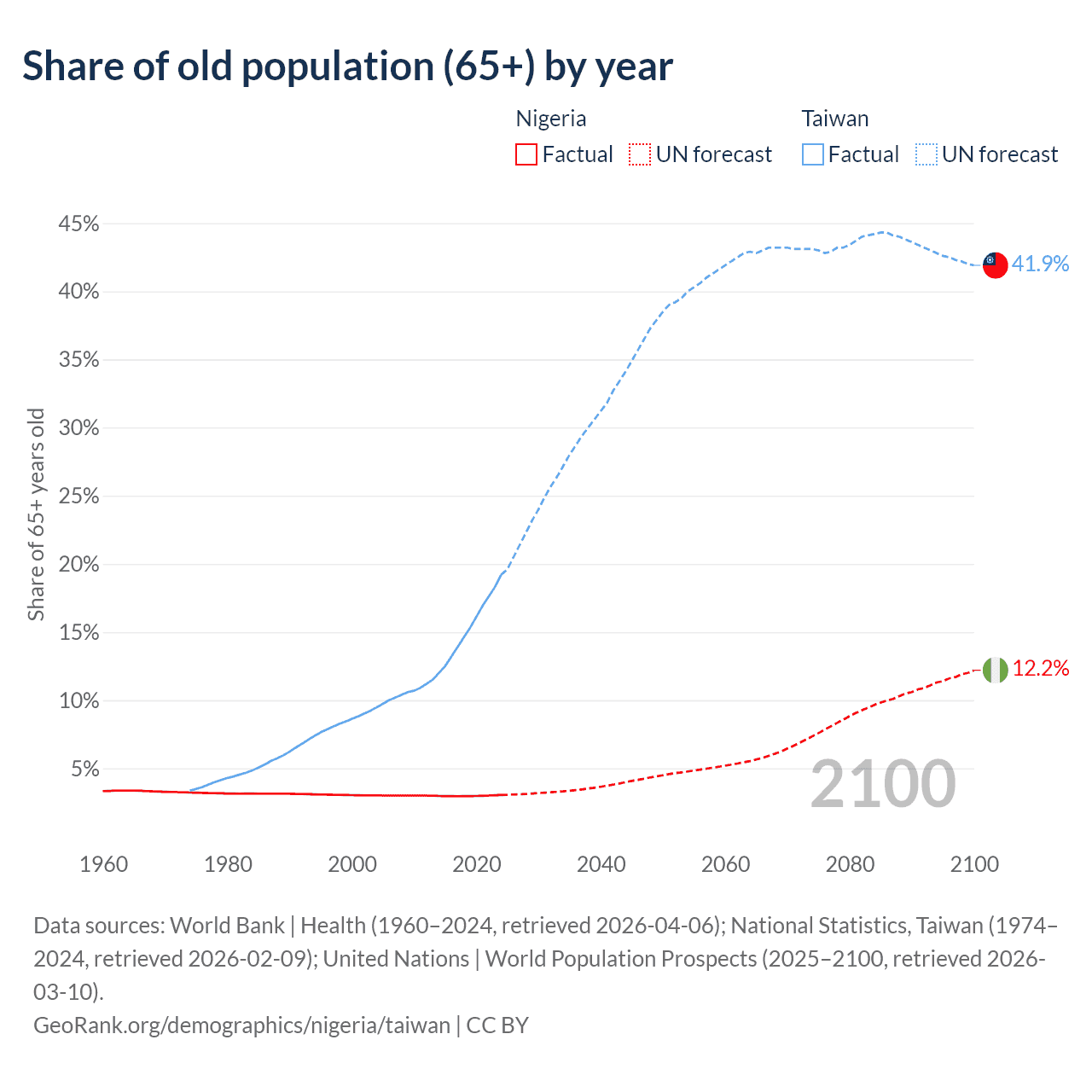 The share of older people aged 65 and over is 3.05% in Nigeria and 19.2% in Taiwan. Life expectancy in Nigeria compared to Taiwan .
