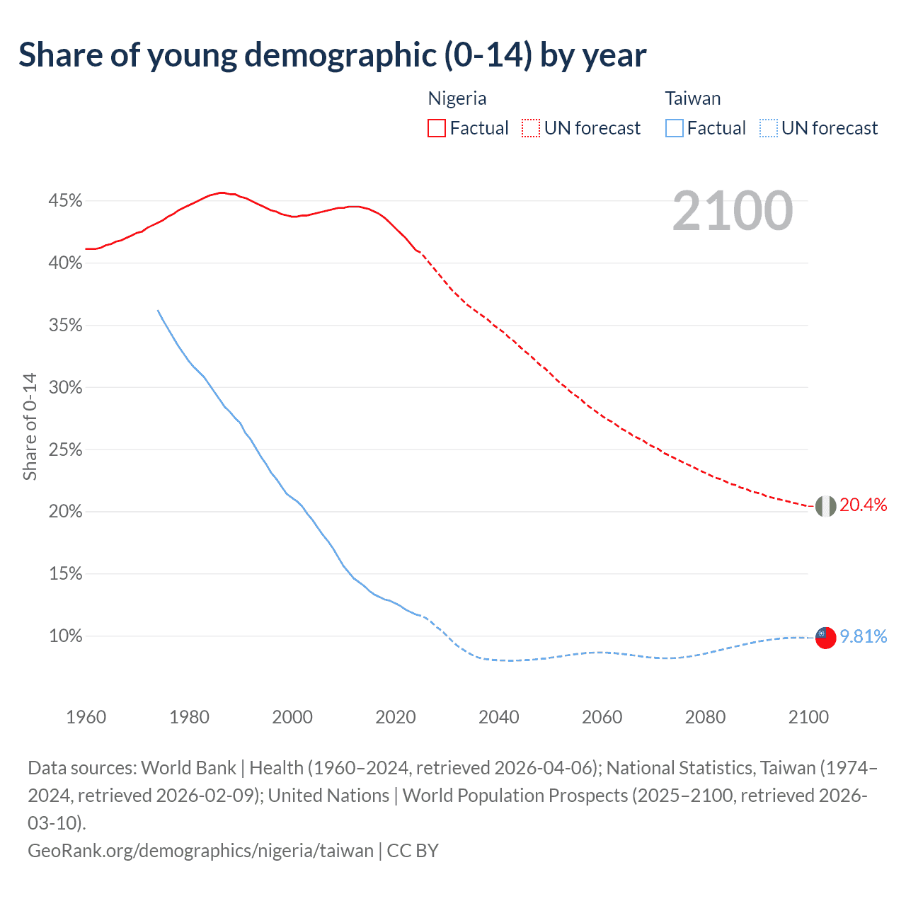 - The share of young demographic (0-15 years old) in Nigeria is 41% vs 11.7% in Taiwan.