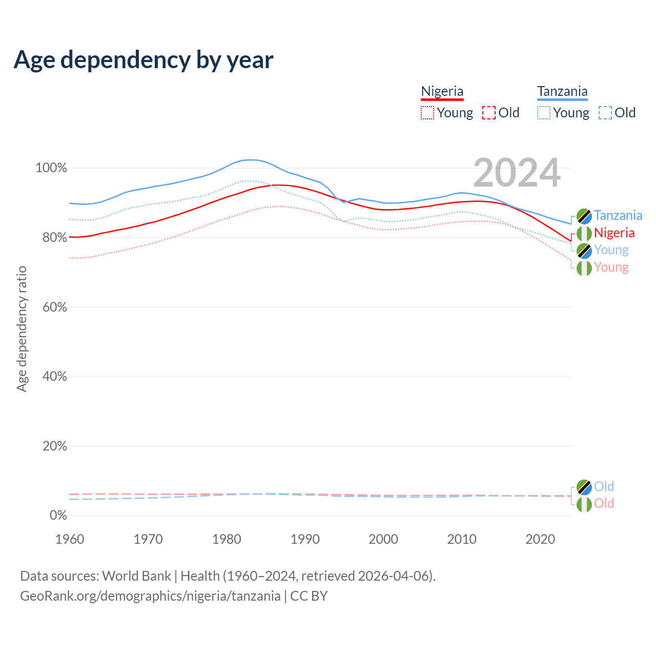 - Nigeria is ranked 178/196 by median age (oldest to youngest) vs 184/196 for Tanzania.