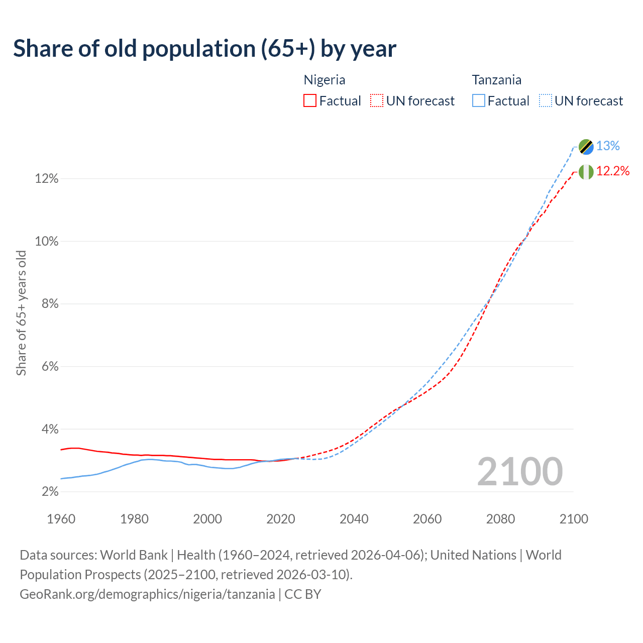 The share of older people aged 65 and over is 3.05% in Nigeria and 3.05% in Tanzania. Life expectancy in Nigeria compared to Tanzania .