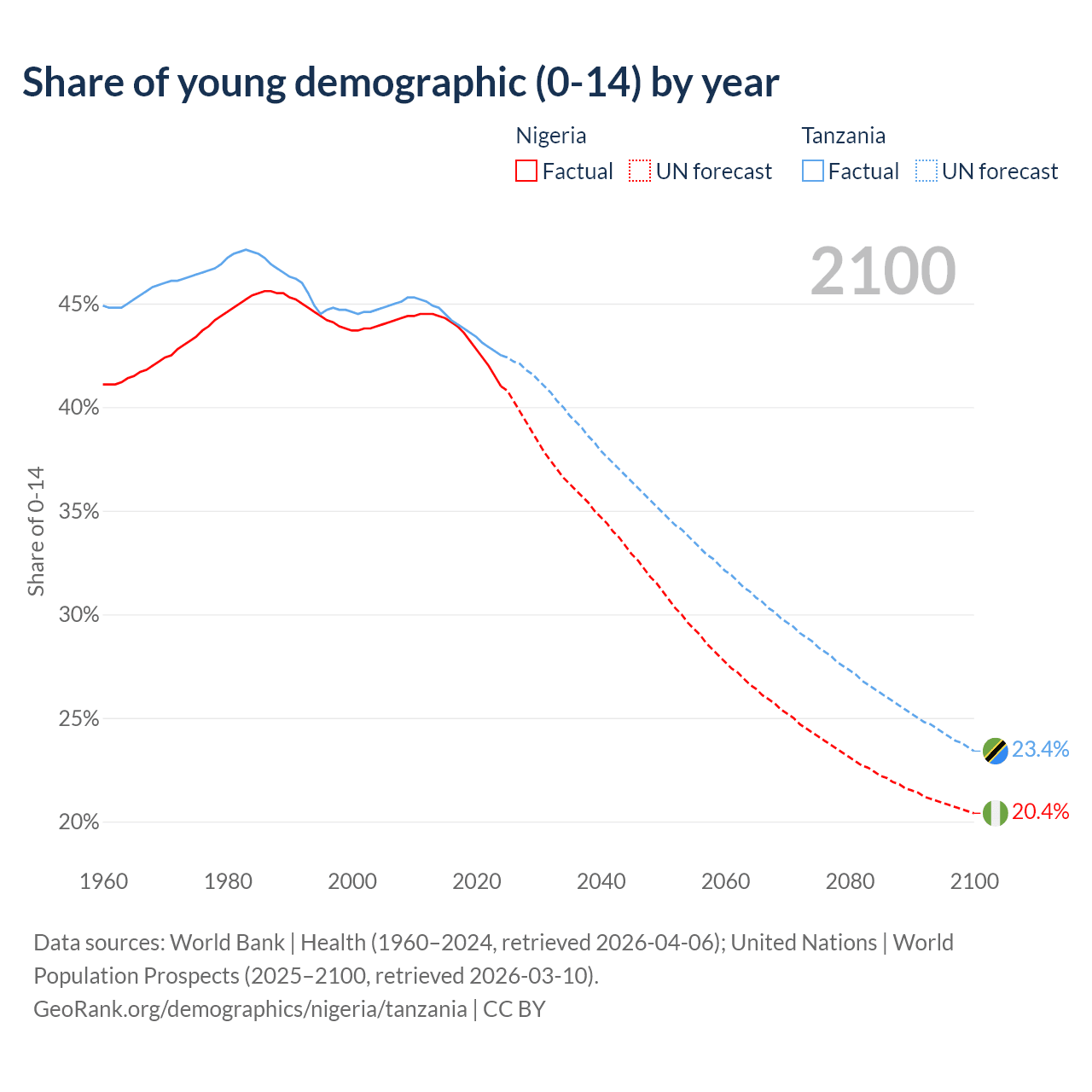 - The share of young demographic (0-15 years old) in Nigeria is 41% vs 42.5% in Tanzania.