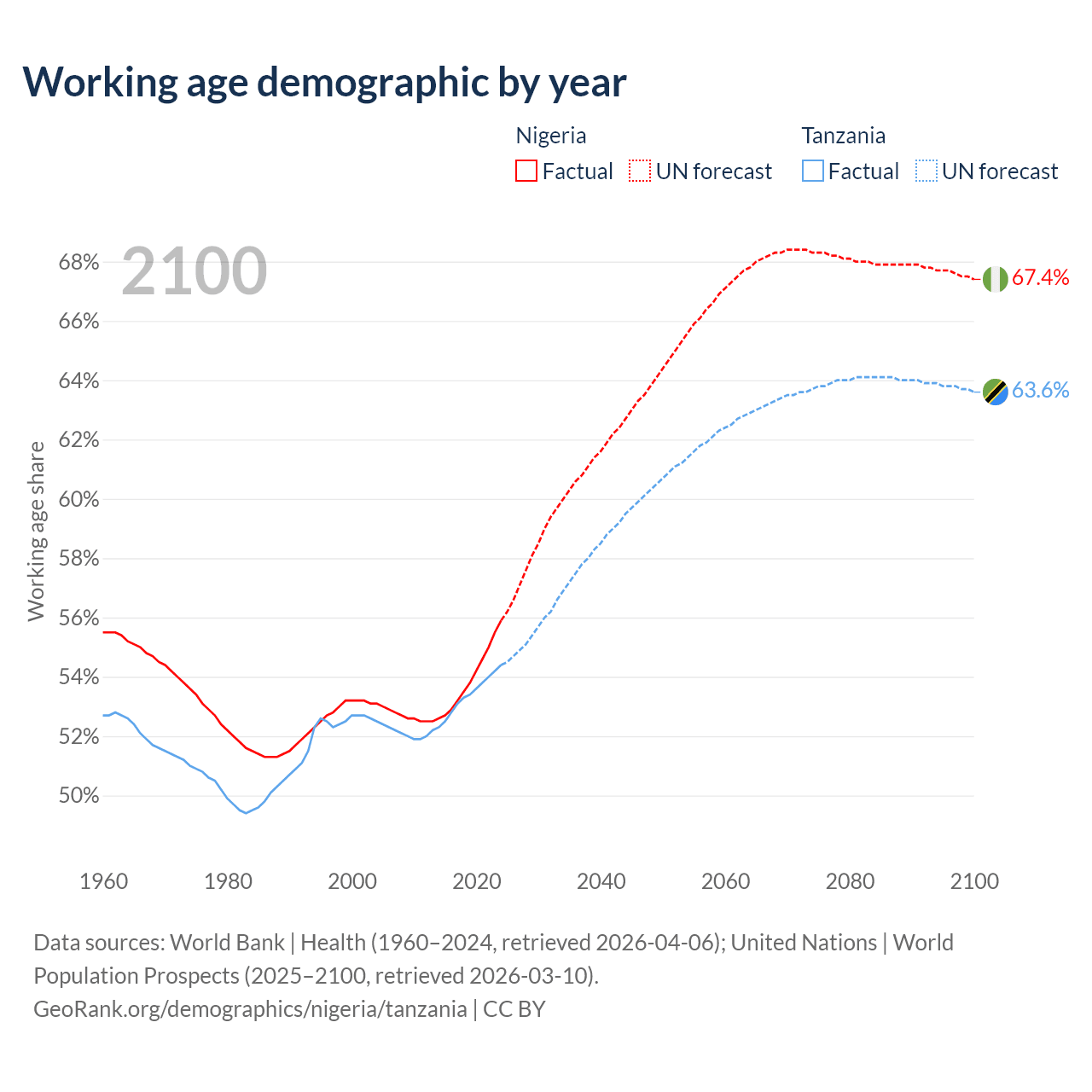 - Nigeria has 136M working age adults (aged 15-64) vs 39.8M in Tanzania.