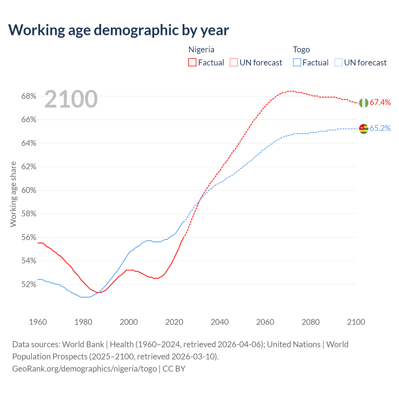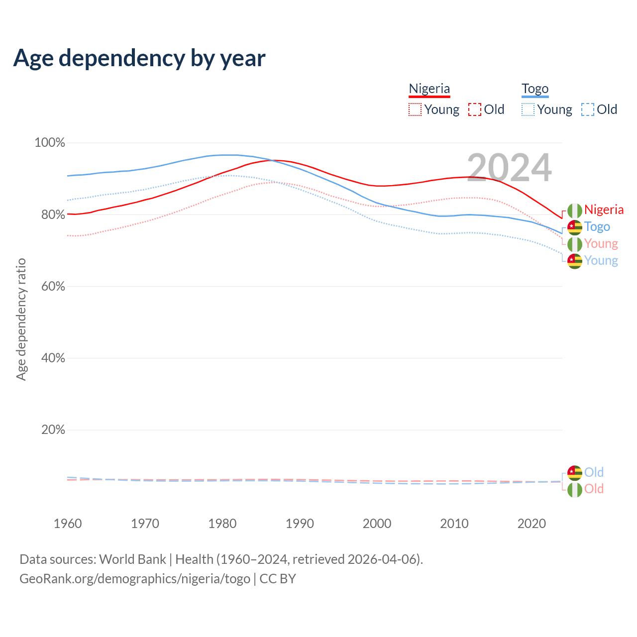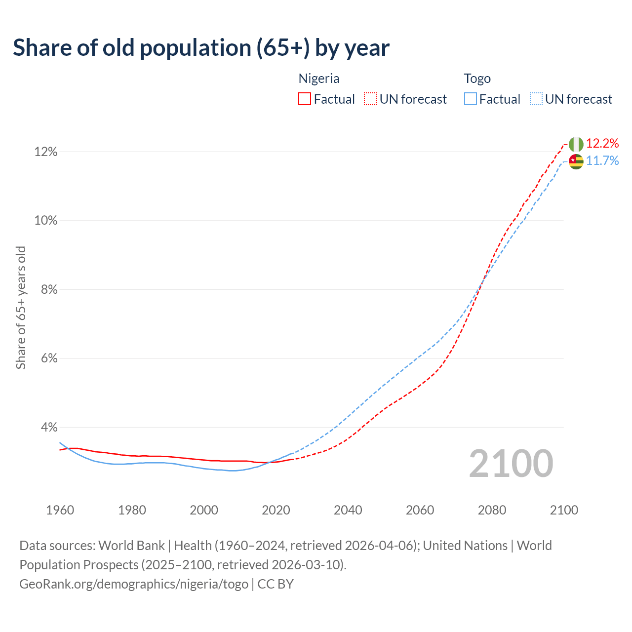 The share of older people aged 65 and over is 3.05% in Nigeria and 3.21% in Togo. Life expectancy in Nigeria compared to Togo .