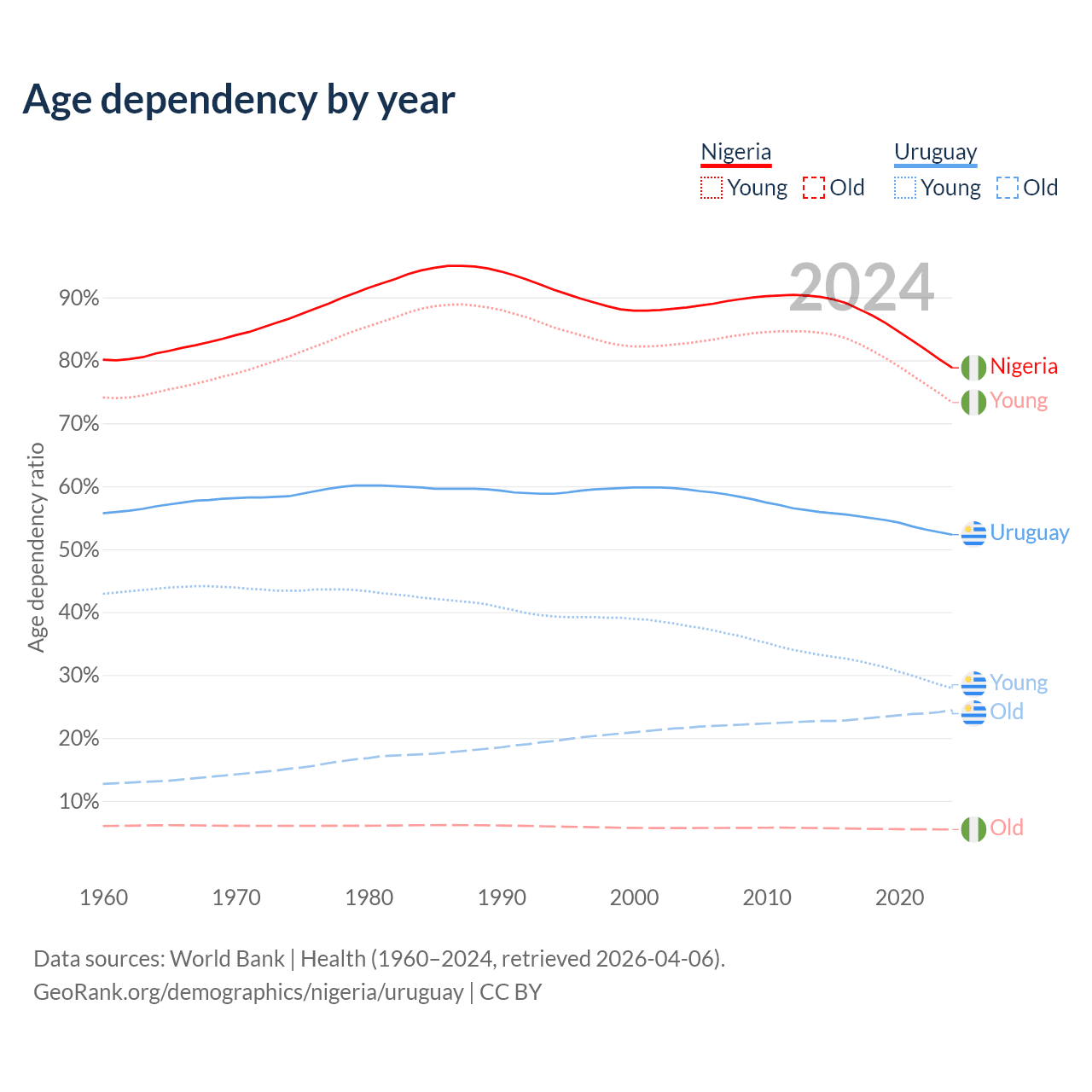 - Nigeria is ranked 178/196 by median age (oldest to youngest) vs 63/196 for Uruguay.