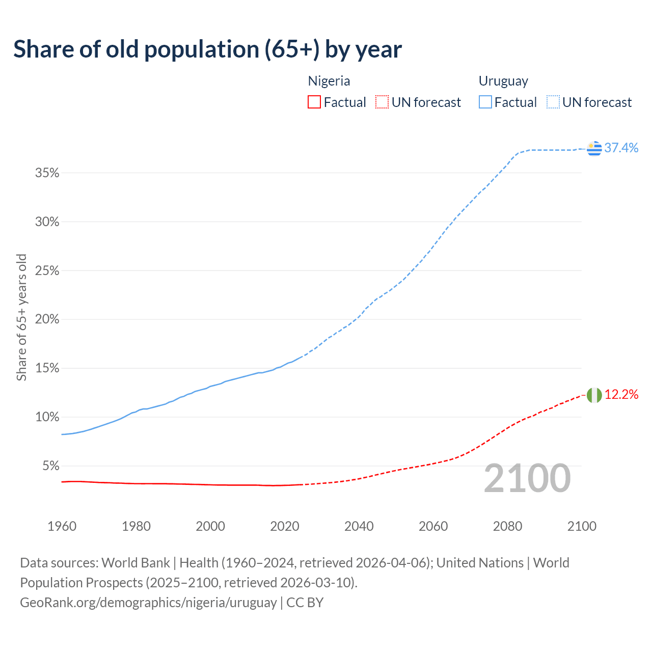 The share of older people aged 65 and over is 3.05% in Nigeria and 16% in Uruguay. Life expectancy in Nigeria compared to Uruguay .