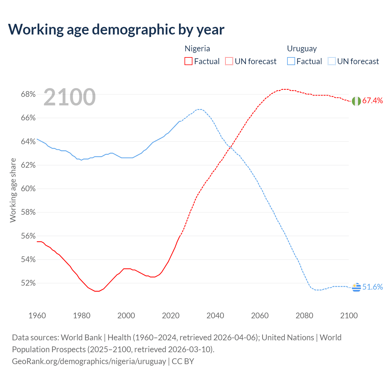 - Nigeria has 136M working age adults (aged 15-64) vs 2.22M in Uruguay.