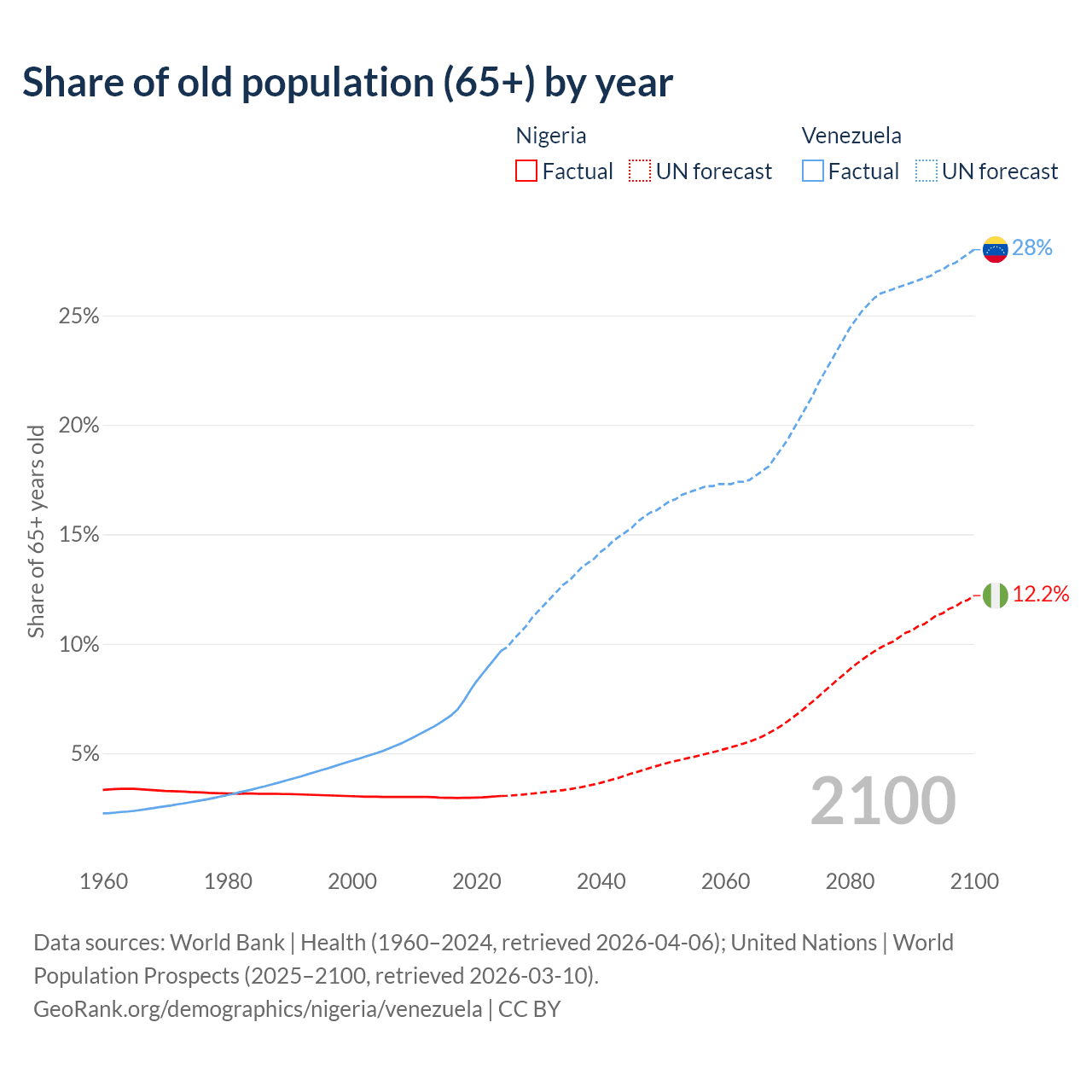 The share of older people aged 65 and over is 3.05% in Nigeria and 9.68% in Venezuela. Life expectancy in Nigeria compared to Venezuela .
