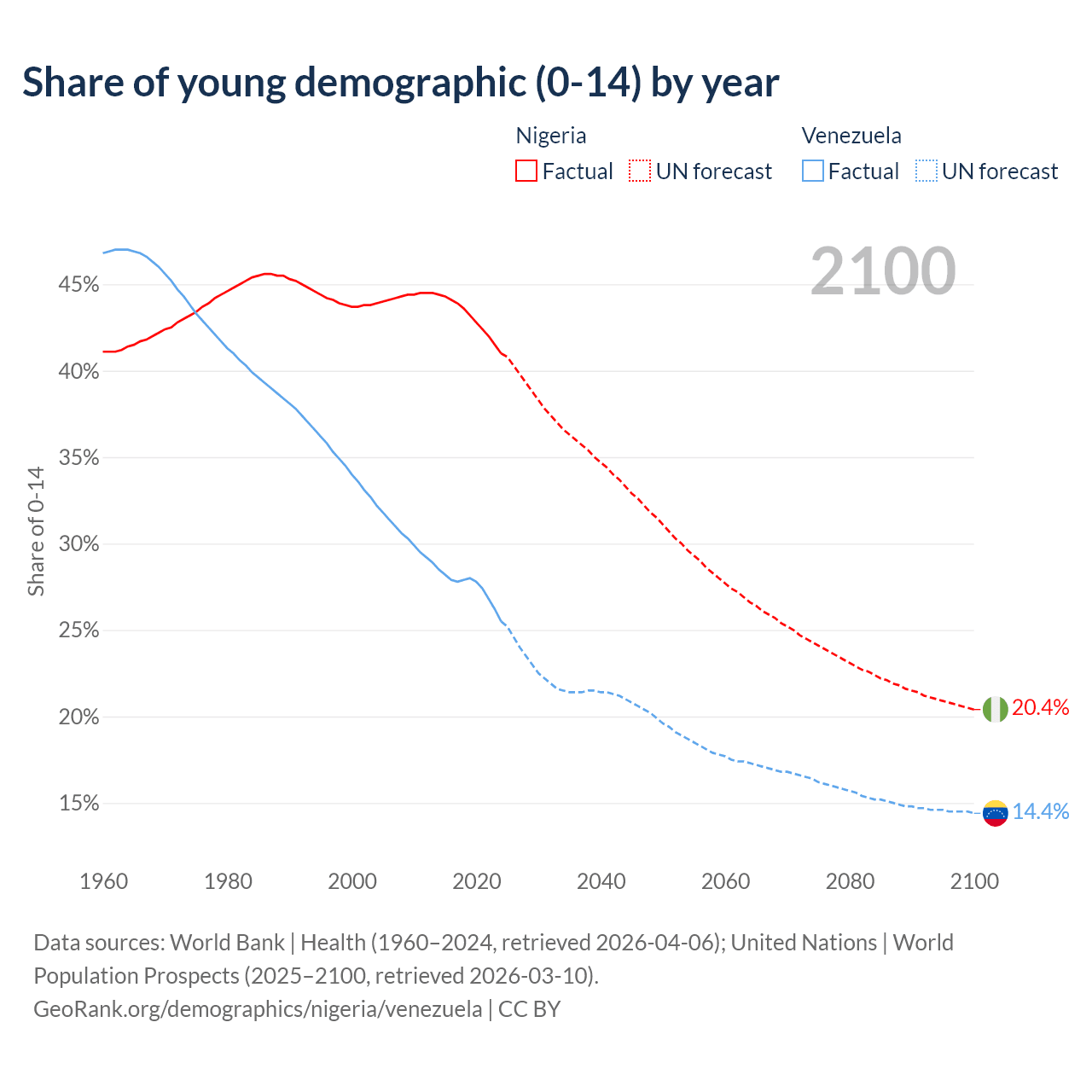 - The share of young demographic (0-15 years old) in Nigeria is 41% vs 25.5% in Venezuela.